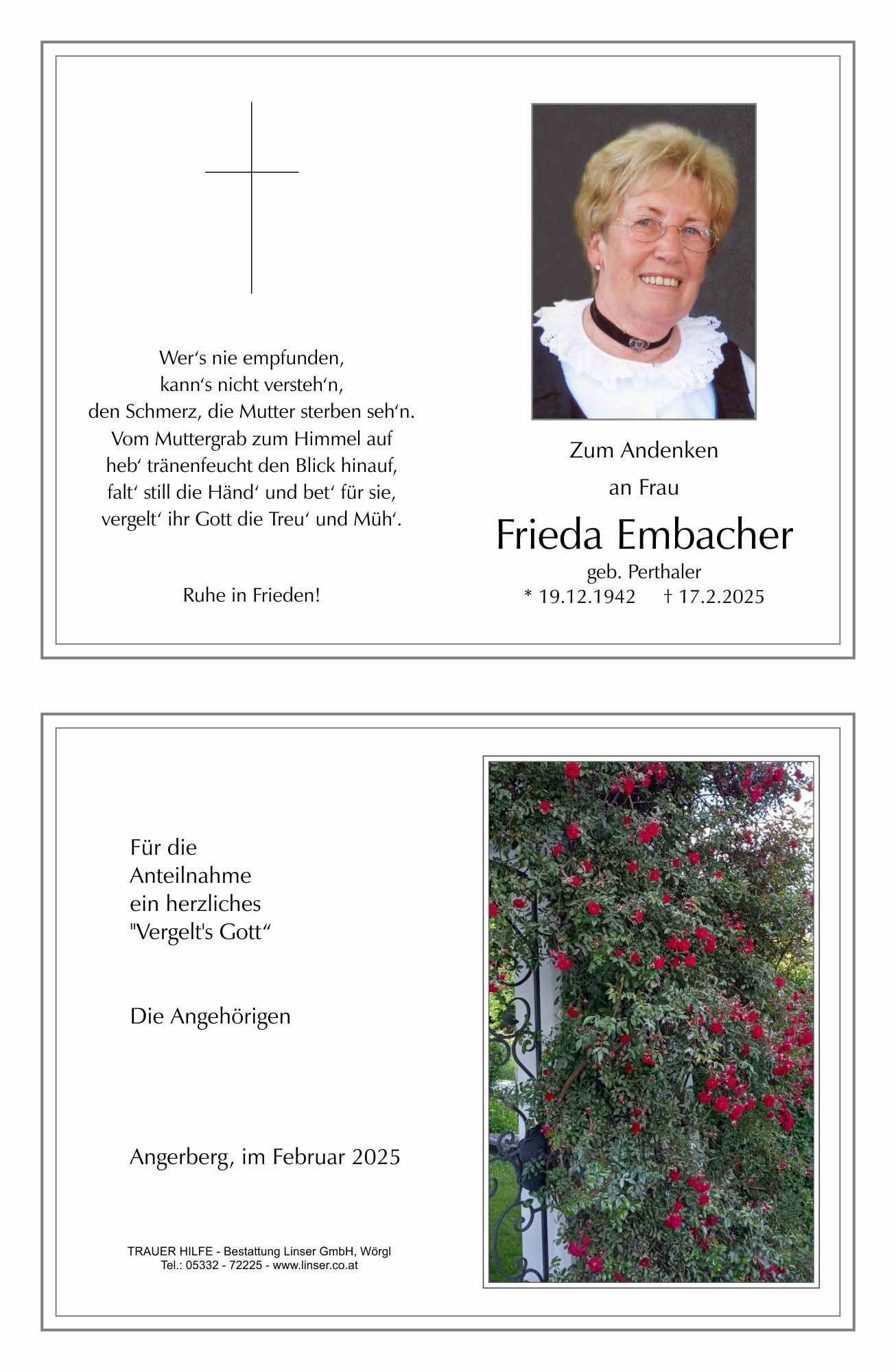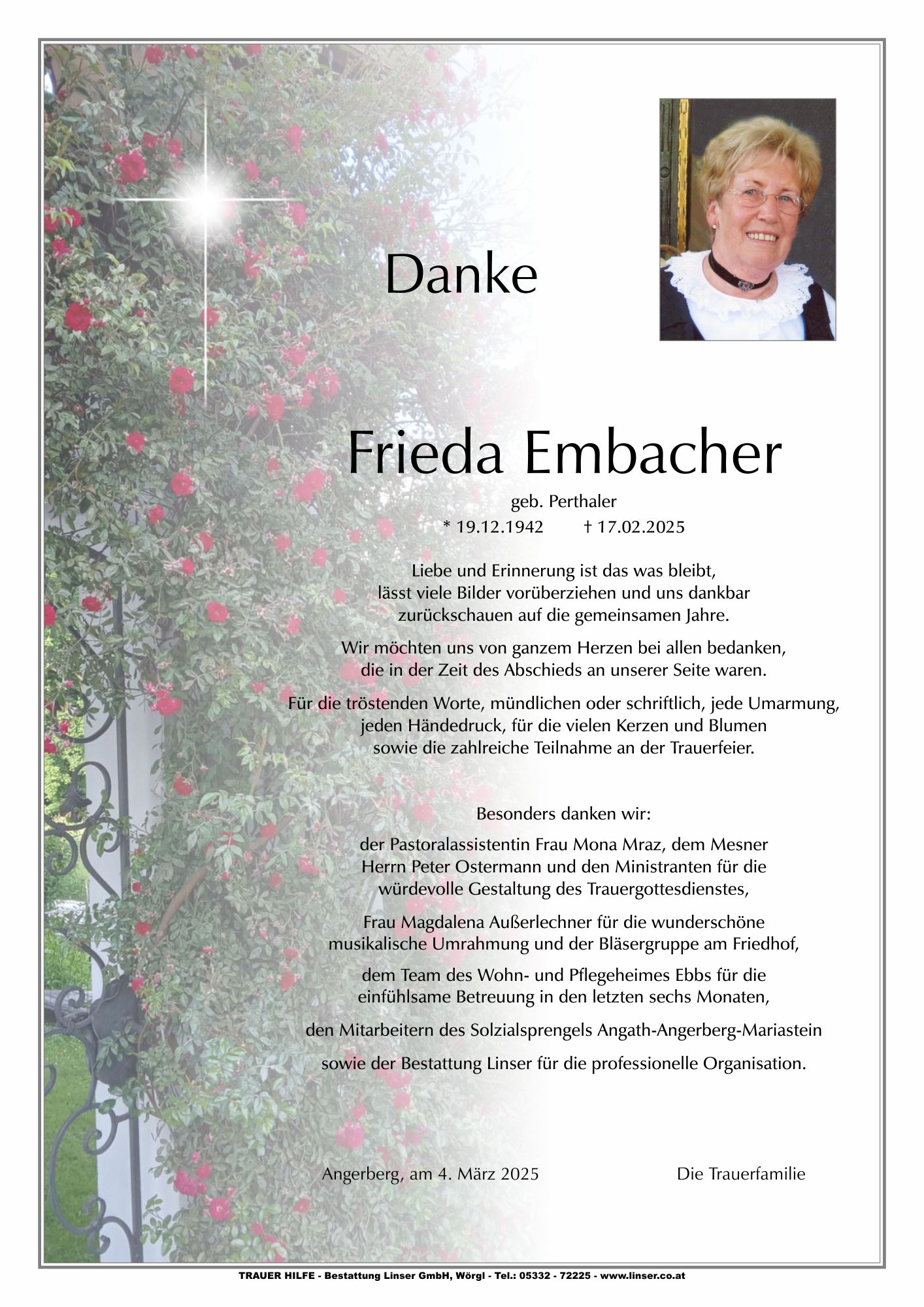 Bestattung wurde durchgeführt von: Walter Linser TrauerHilfe Bestattung Linser GmbH Wildschönauerstraße 41 6300 - Wörgl Tel.: 05332 72225 zum Bestatter