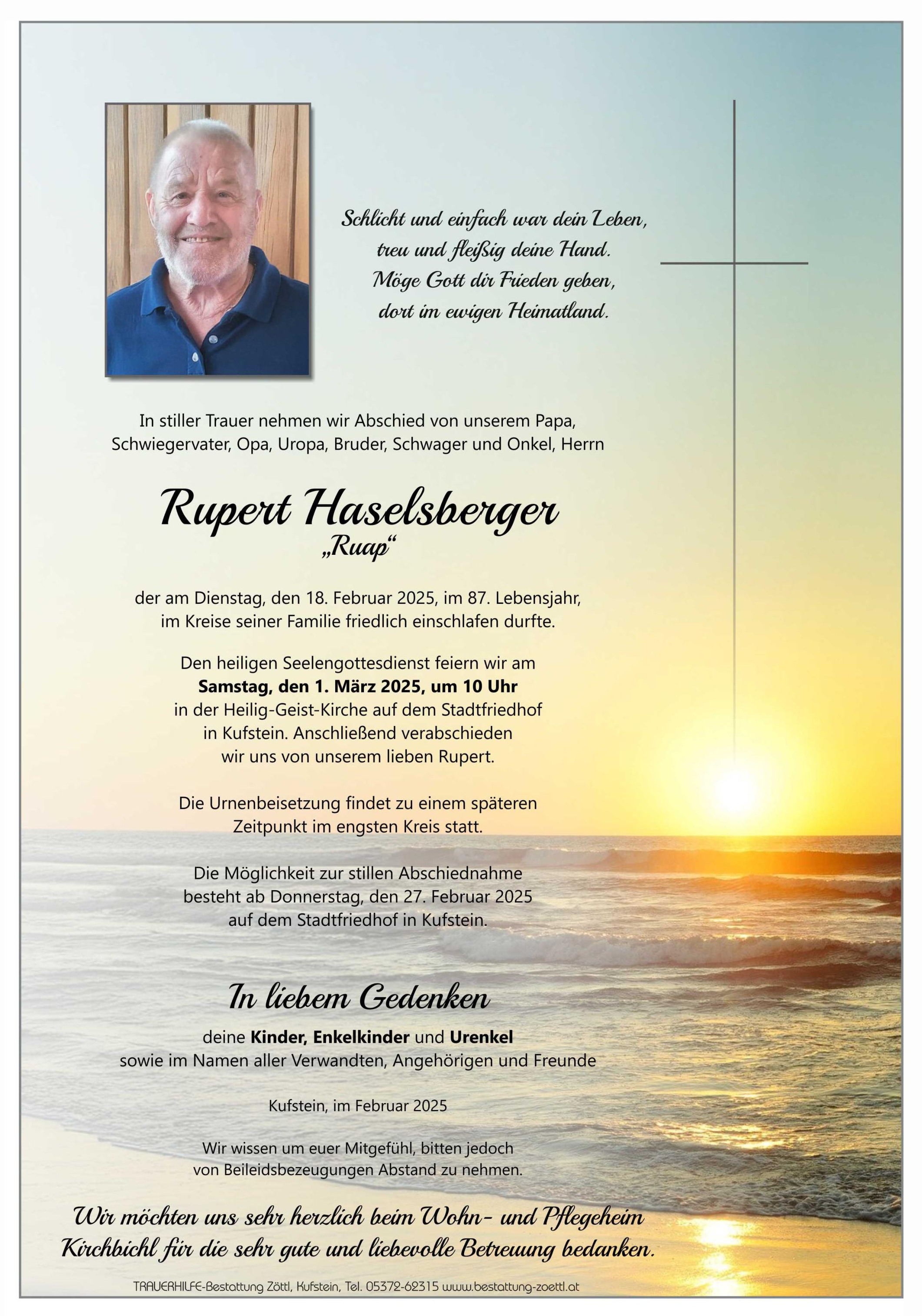 Bestattung wurde durchgeführt von: Florian Zöttl TrauerHilfe Bestattung Zöttl Andreas Hofer Str. 2 6330 - Kufstein Tel.: 05372 6 23 15 zum Bestatter