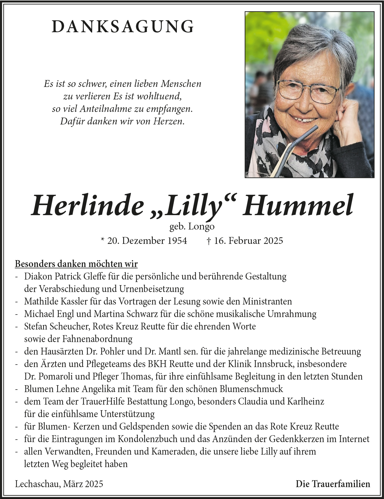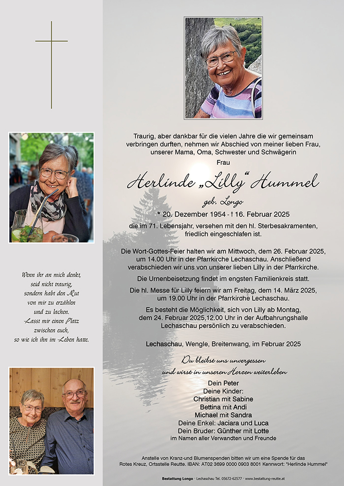 Mögen die Erinnerungen an die gemeinsame Zeit mit Eurer „Lilly“, Euch Kraft und Zuversicht geben. Im Namen des Pensionisten Verbandes der Ortsgruppe Lechaschau darf ich Euch unsere aufrichtige Anteilnahme in dieser schweren Zeit entbieten.