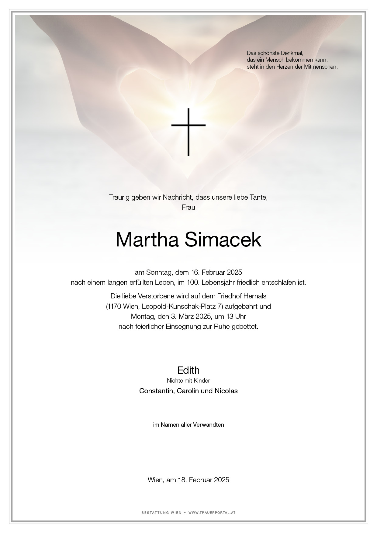 Bestattung wurde durchgeführt von: Bestattung Wien Bestattung Wien GmbH Simmeringer Hauptstraße 339 1110 - Wien (Simmering) Tel.: 01 501950 zum Bestatter