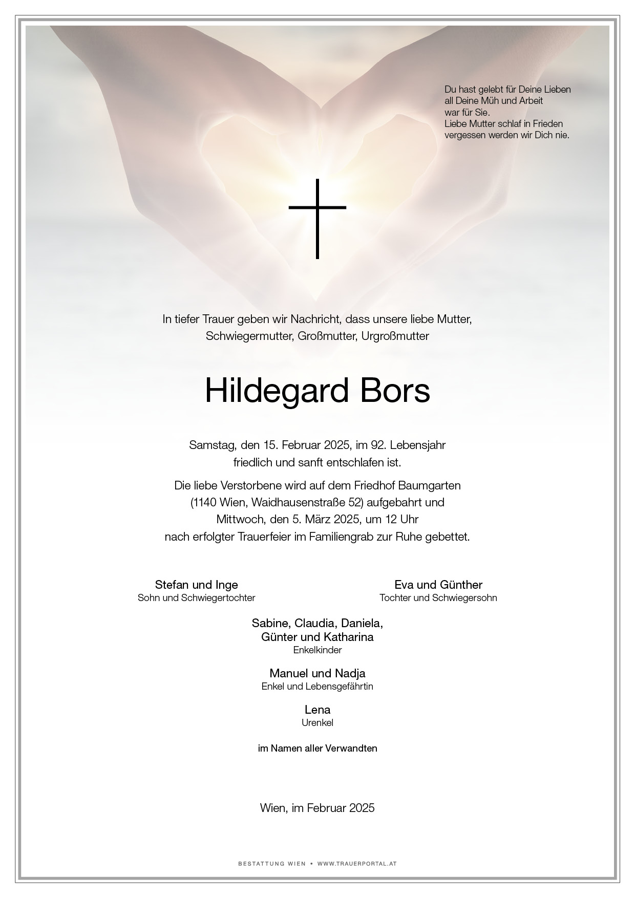 Bestattung wurde durchgeführt von: Bestattung Wien Bestattung Wien GmbH Simmeringer Hauptstraße 339 1110 - Wien (Simmering) Tel.: 01 501950 zum Bestatter