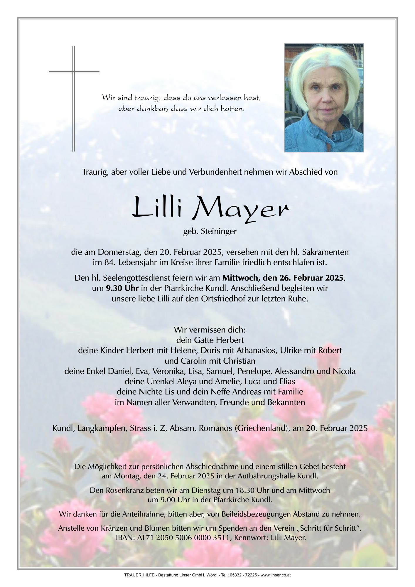 Bestattung wurde durchgeführt von: Walter Linser TrauerHilfe Bestattung Linser GmbH Wildschönauerstraße 41 6300 - Wörgl Tel.: 05332 72225 zum Bestatter