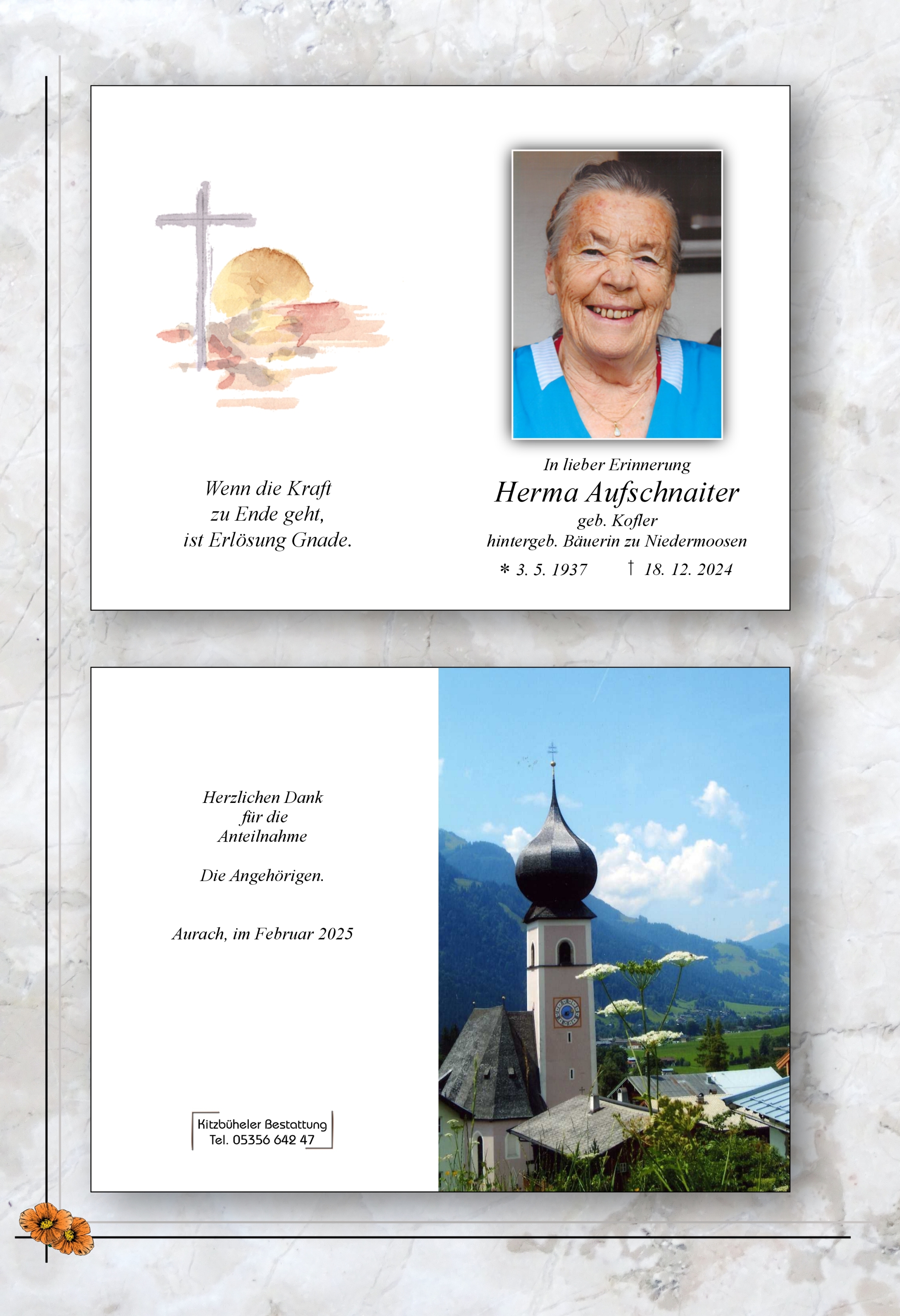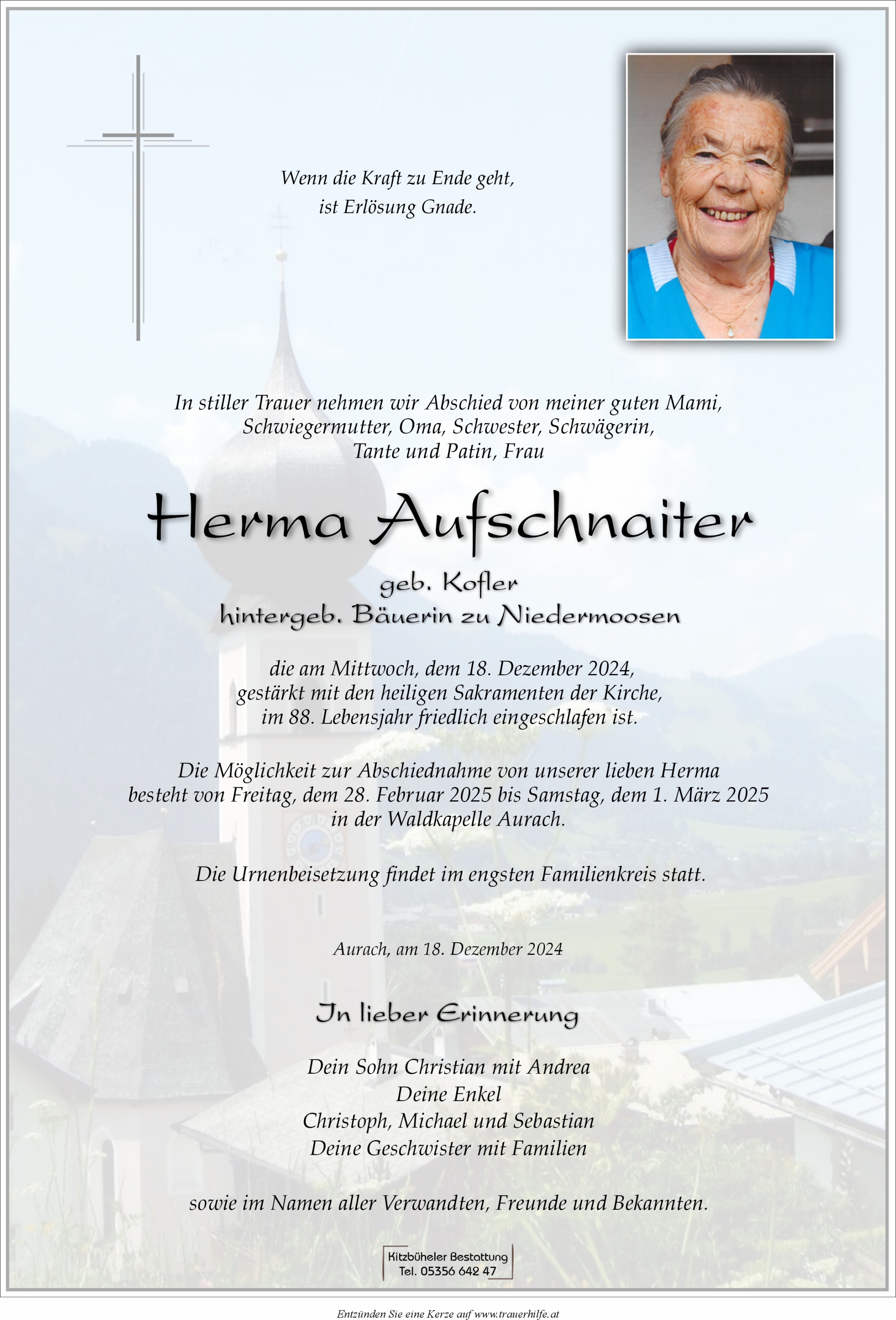 Bestattung wurde durchgeführt von: Kitzbüheler Bestattung Kitzbüheler Bestattung Kitzbüheler Bestattung WV GmbH Jochberger Straße 62 6370 - Kitzbühel Tel.: 05356 642 47 Tel.: 050 1717 180 zum Bestatter