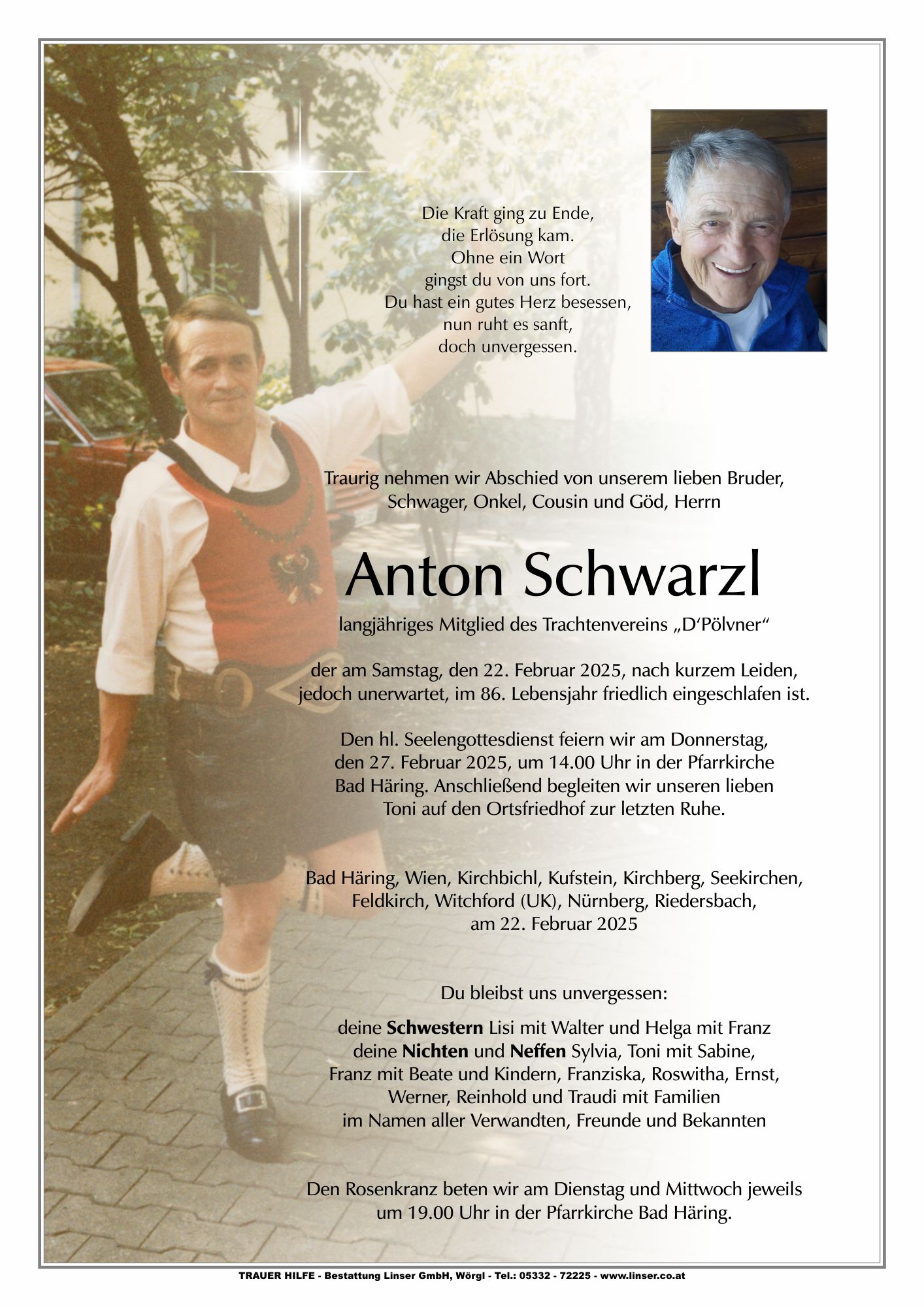 Bestattung wurde durchgeführt von: Walter Linser TrauerHilfe Bestattung Linser GmbH Wildschönauerstraße 41 6300 - Wörgl Tel.: 05332 72225 zum Bestatter