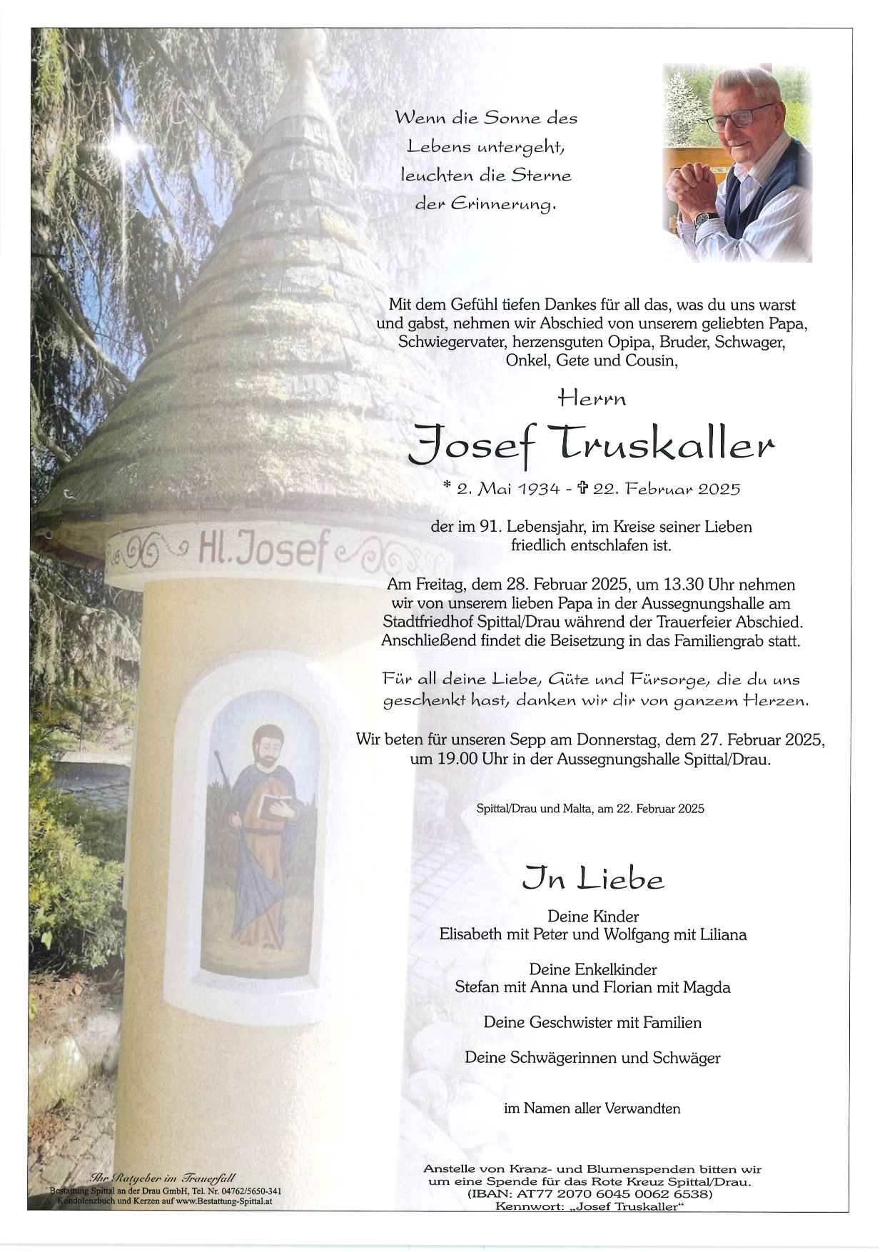 Bestattung wurde durchgeführt von: Gerald Baumgartner/Franz Kramaritsch/Sylvia Wippl Gerald Baumgartner/Franz Kramaritsch/Sylvia Wippl Städtische Bestattungsanstalt Spittal an der Drau Edlinger Straße 55 9800 - Spittal an der Drau Tel.: 04762 5650341 zum Bestatter