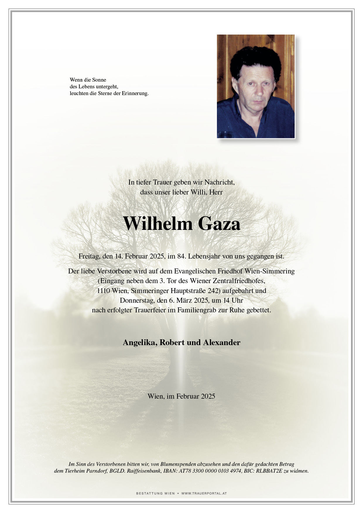 Bestattung wurde durchgeführt von: Bestattung Wien Bestattung Wien GmbH Simmeringer Hauptstraße 339 1110 - Wien (Simmering) Tel.: 01 501950 zum Bestatter