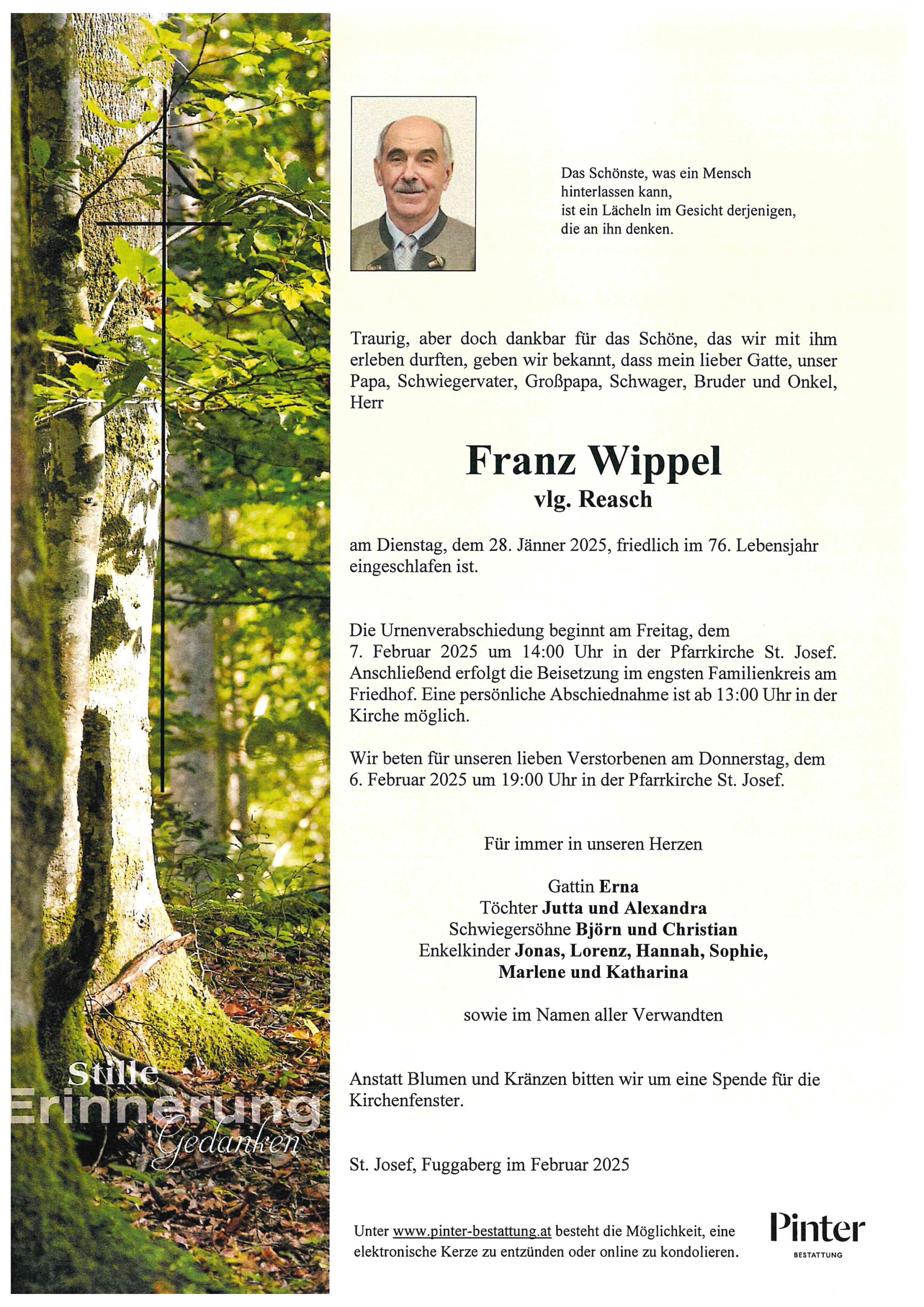 Bestattung wurde durchgeführt von: Pinter GmbH Pinter GmbH Nelkengasse 1-3 8530 - Deutschlandsberg Tel.: +43 3462 2907 zum Bestatter