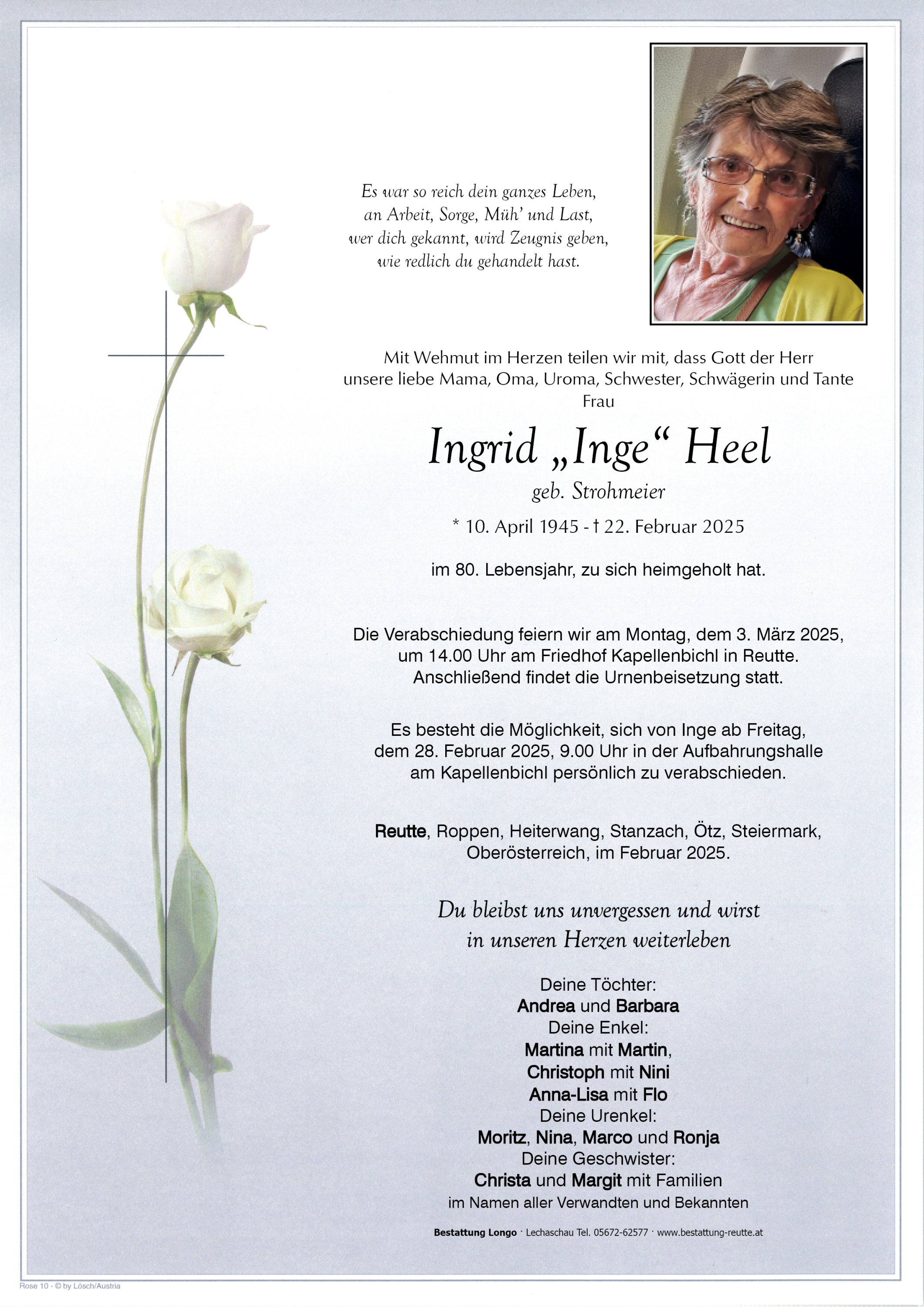 Bestattung wurde durchgeführt von: Claudia Schreieck Bestattung Longo Lechtalerstraße 32a 6600 - Lechaschau Tel.: 05672 62577 zum Bestatter