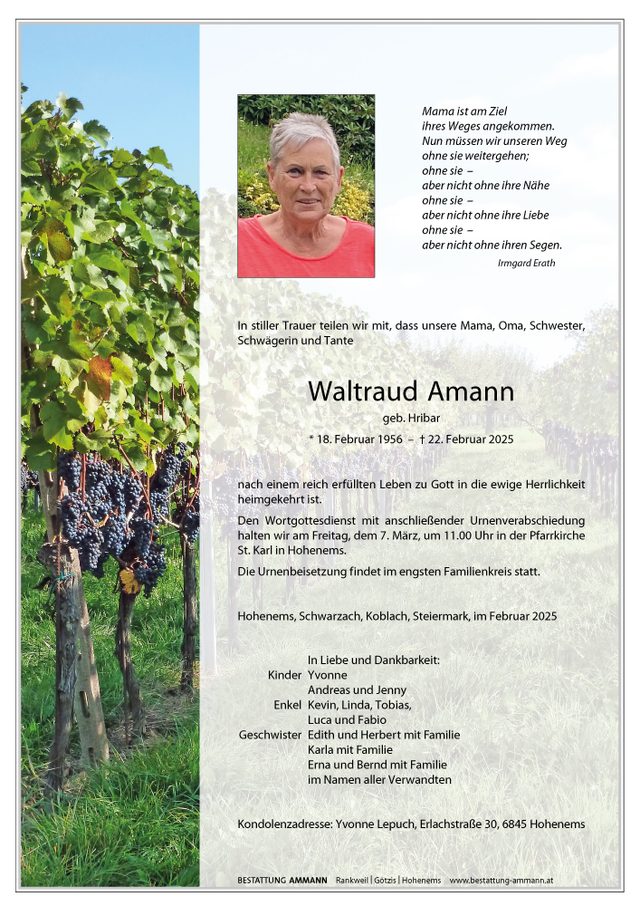 Bestattung wurde durchgeführt von: Bestattung Ammann Rankweil Ammann Bestattung GmbH Rankweil Splügenweg 1 6830 - Rankweil Tel.: 05522 42104 zum Bestatter