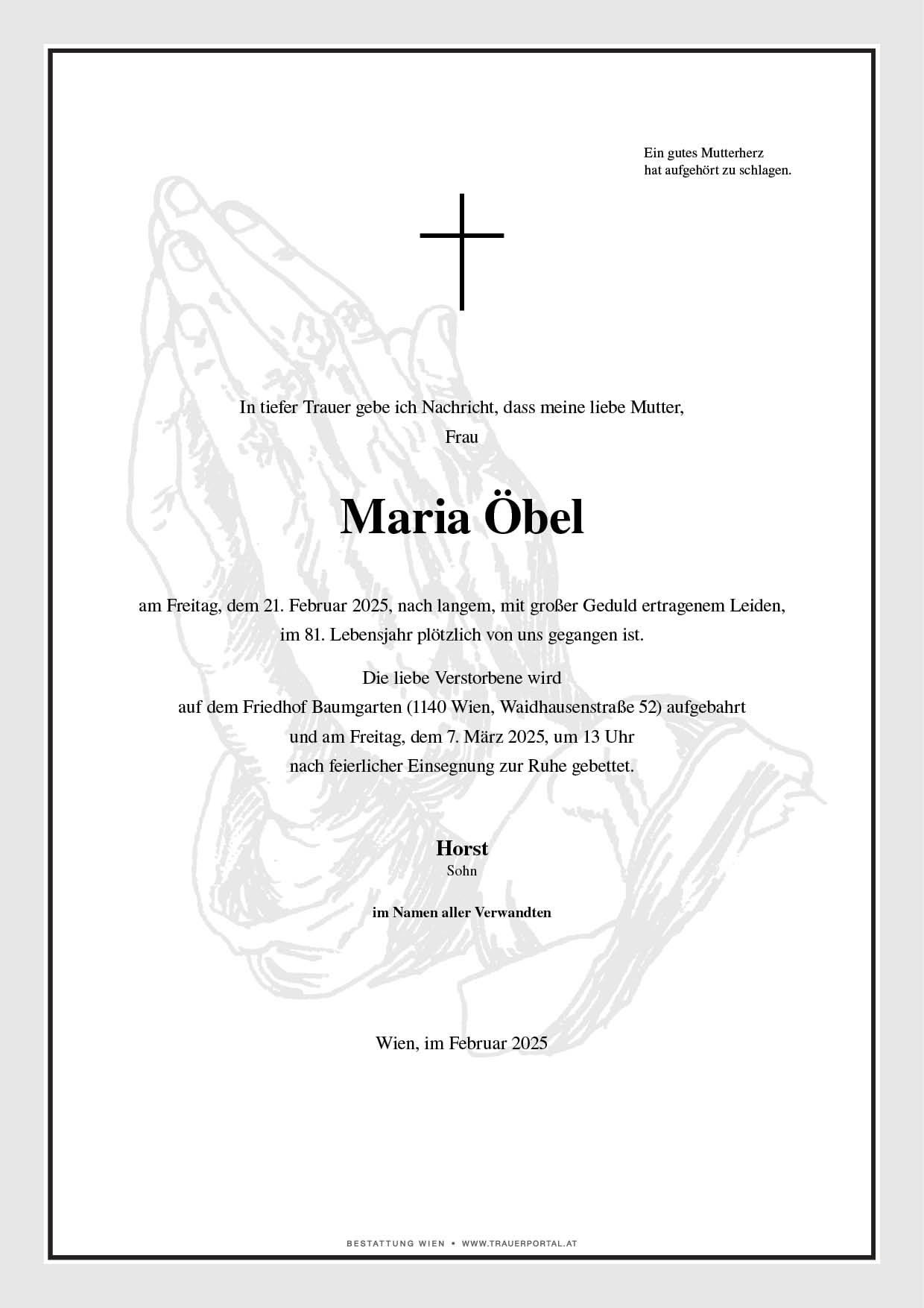 Bestattung wurde durchgeführt von: Bestattung Wien Bestattung Wien GmbH Simmeringer Hauptstraße 339 1110 - Wien (Simmering) Tel.: 01 501950 zum Bestatter