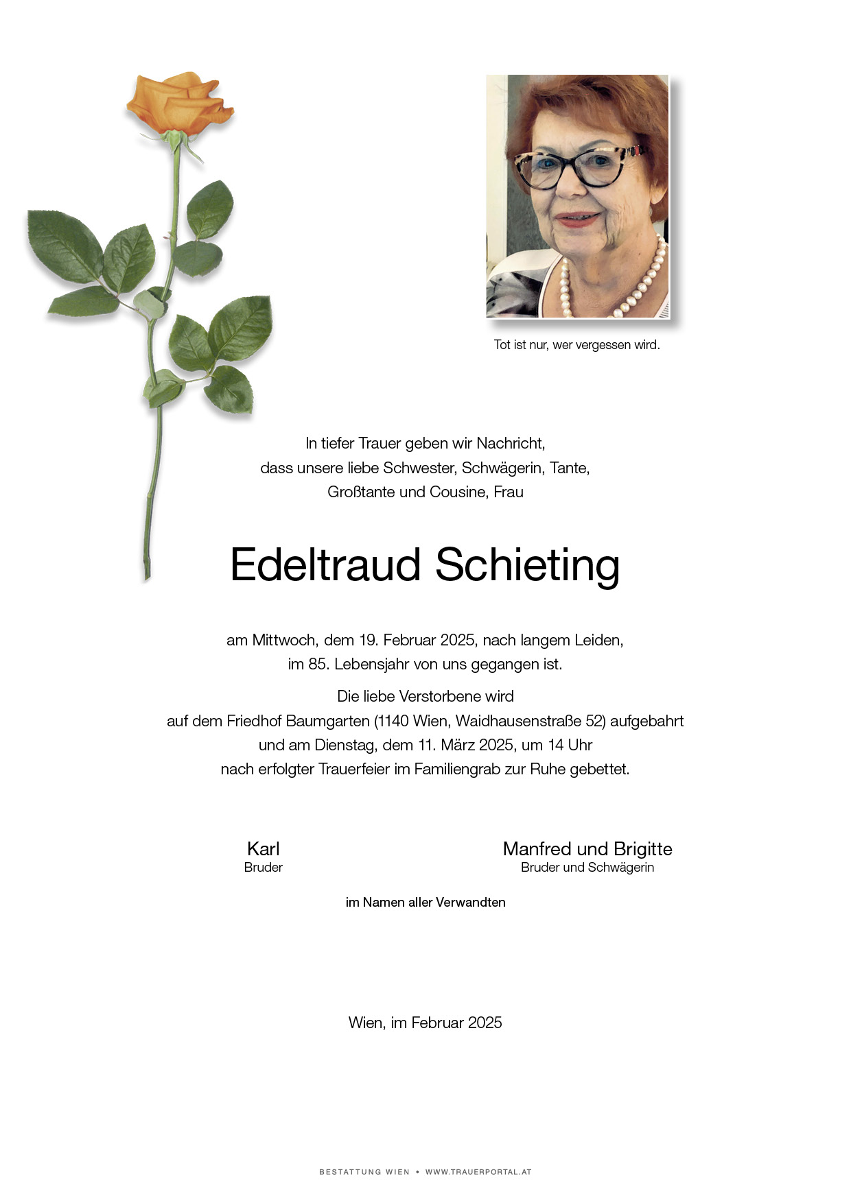 Bestattung wurde durchgeführt von: Bestattung Wien Bestattung Wien GmbH Simmeringer Hauptstraße 339 1110 - Wien (Simmering) Tel.: 01 501950 zum Bestatter