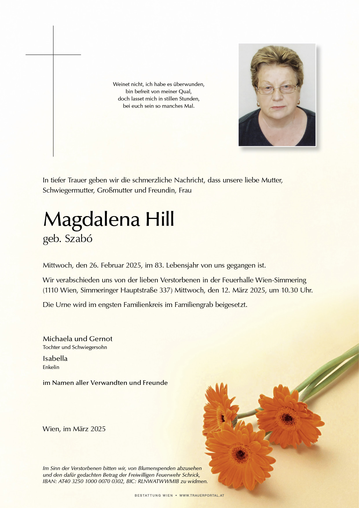 Bestattung wurde durchgeführt von: Bestattung Wien Bestattung Wien GmbH Simmeringer Hauptstraße 339 1110 - Wien (Simmering) Tel.: 01 501950 zum Bestatter