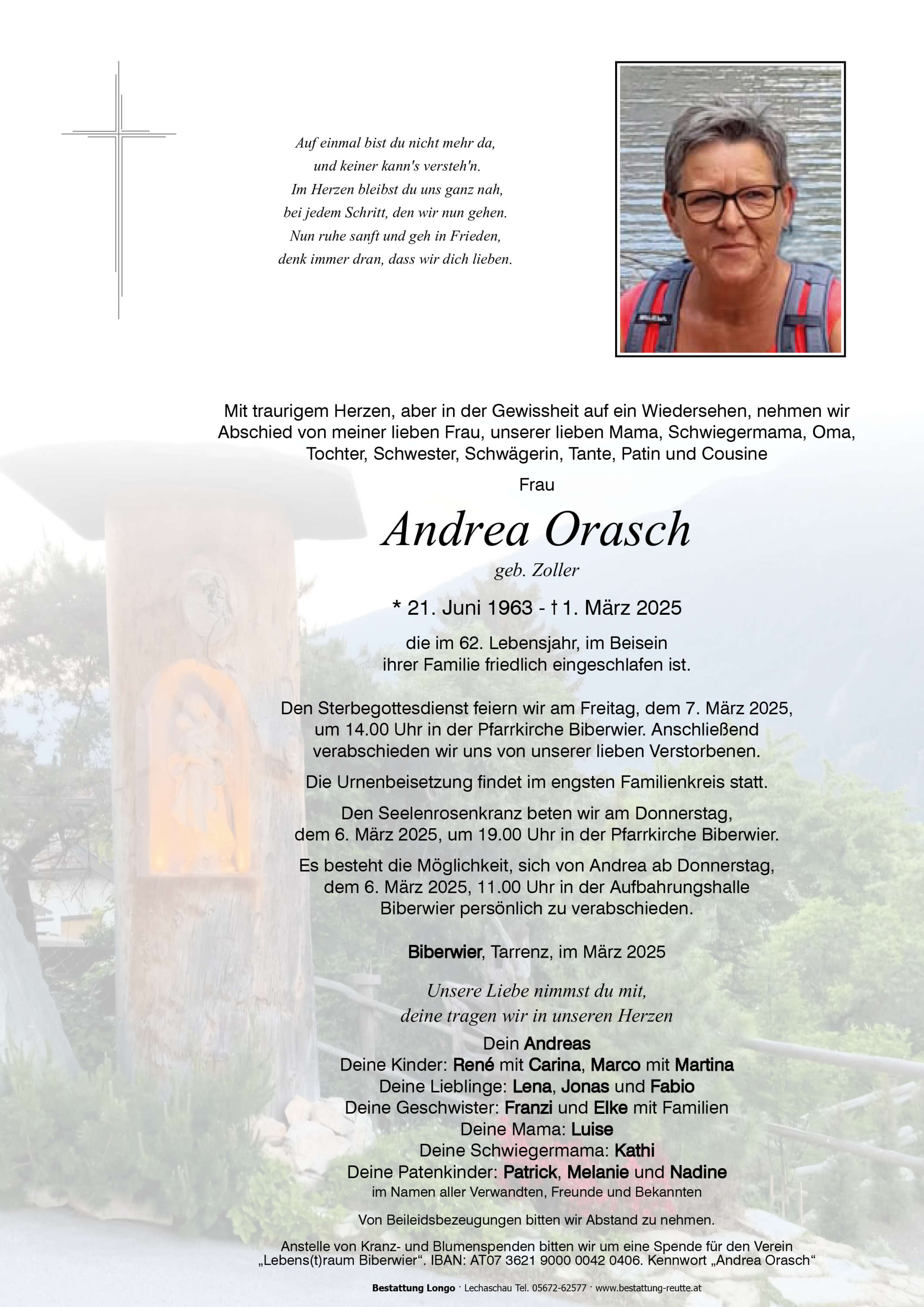 (Jes. 43). Wir wünschen Euch viel Kraft in diesen schweren Stunden.Liebe Andrea machs gut wo auch immer du jetzt bist ,ich werde deine nette und lustige Art in Erinnerung behalten . Aufrichtige Anteilnahme entbieten Andrea, Günther,Ramona Stefan und Viktor