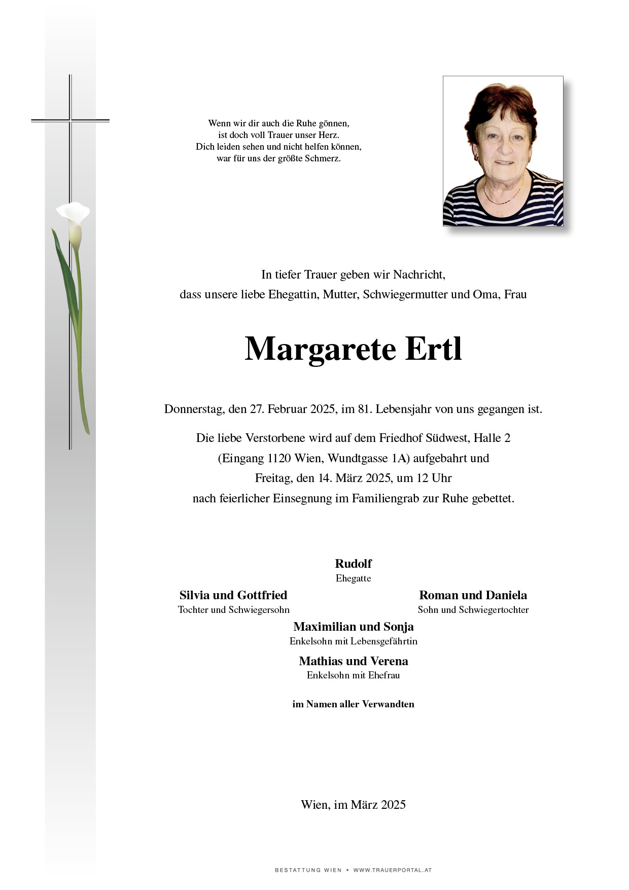 Bestattung wurde durchgeführt von: Bestattung Wien Bestattung Wien GmbH Simmeringer Hauptstraße 339 1110 - Wien (Simmering) Tel.: 01 501950 zum Bestatter
