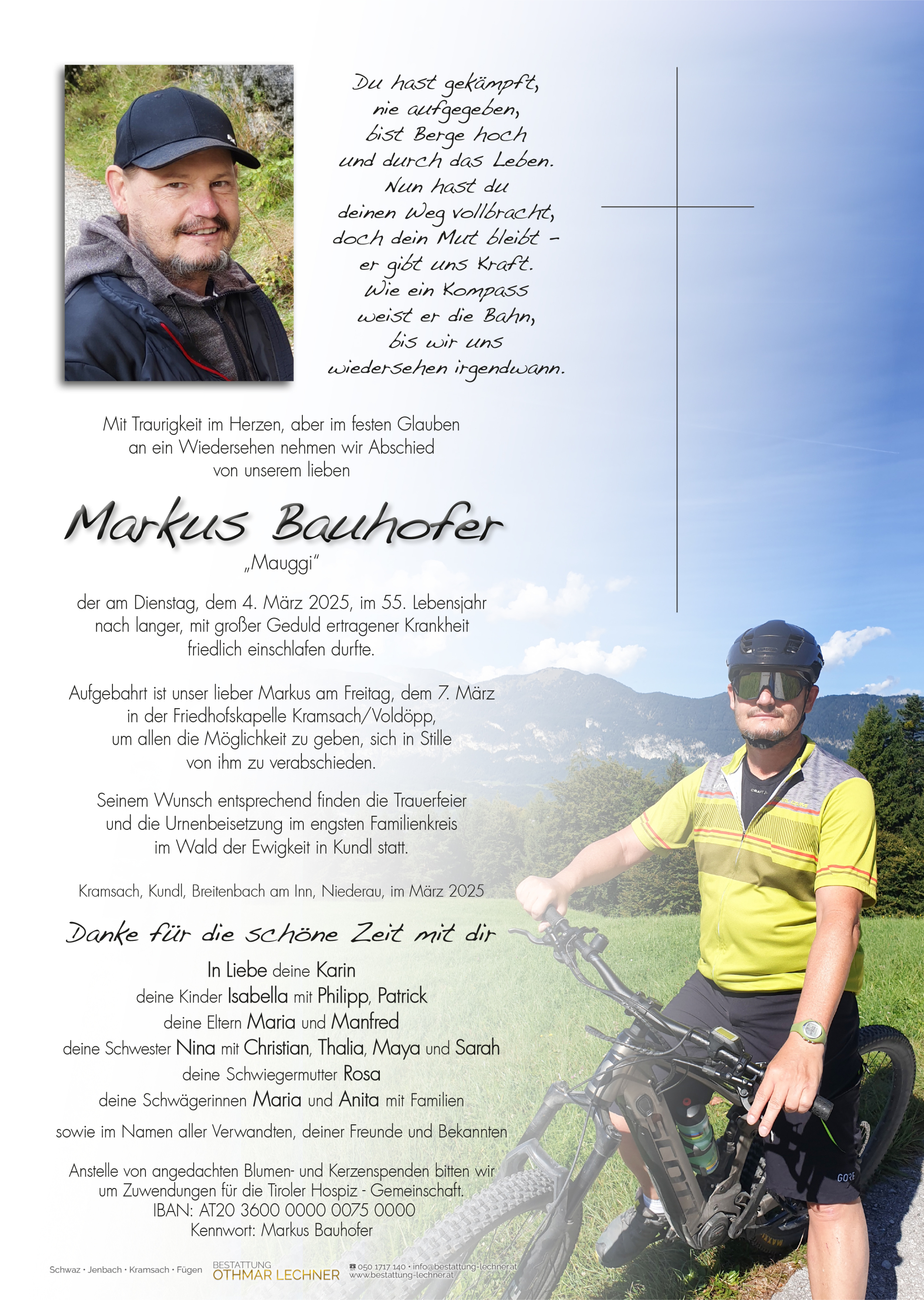 Möge Euch die Zuversicht auf ein Wiedersehen mit Markus immer begleiten.05.03.2025 13:44 - Fam. Klaus und Uschi Kostenzer