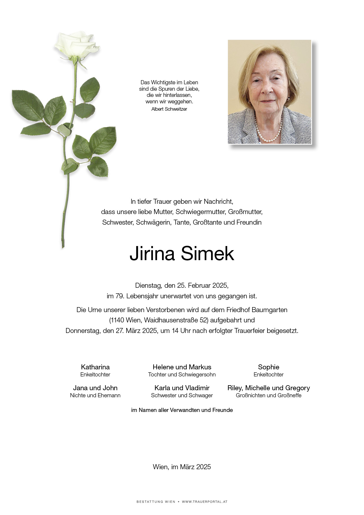 Bestattung wurde durchgeführt von: Bestattung Wien Bestattung Wien GmbH Simmeringer Hauptstraße 339 1110 - Wien (Simmering) Tel.: 01 501950 zum Bestatter
