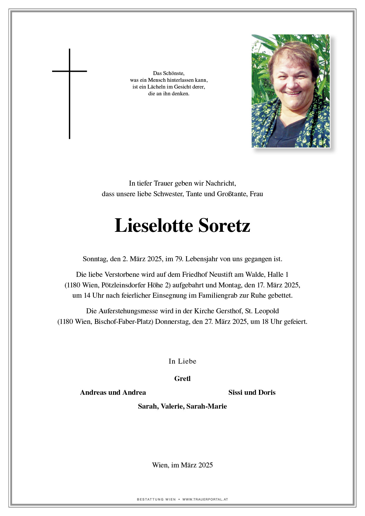 Bestattung wurde durchgeführt von: Bestattung Wien Bestattung Wien GmbH Simmeringer Hauptstraße 339 1110 - Wien (Simmering) Tel.: 01 501950 zum Bestatter