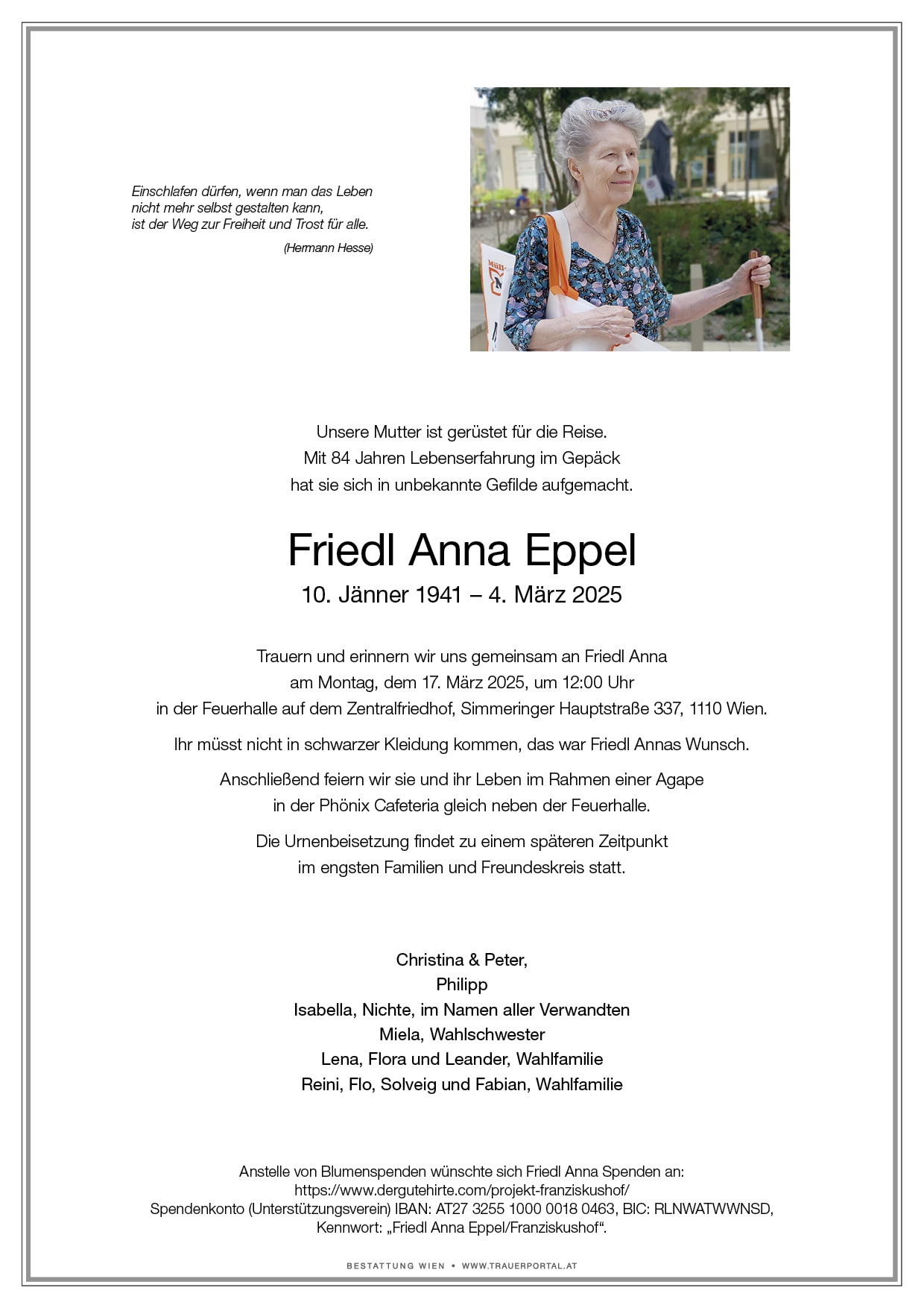 Bestattung wurde durchgeführt von: Bestattung Wien Bestattung Wien GmbH Simmeringer Hauptstraße 339 1110 - Wien (Simmering) Tel.: 01 501950 zum Bestatter