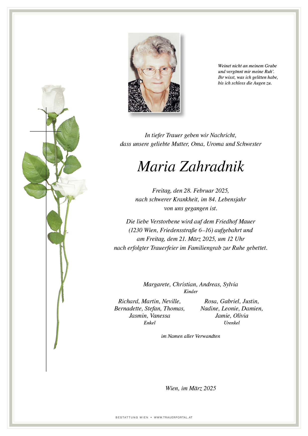 Bestattung wurde durchgeführt von: Bestattung Wien Bestattung Wien GmbH Simmeringer Hauptstraße 339 1110 - Wien (Simmering) Tel.: 01 501950 zum Bestatter