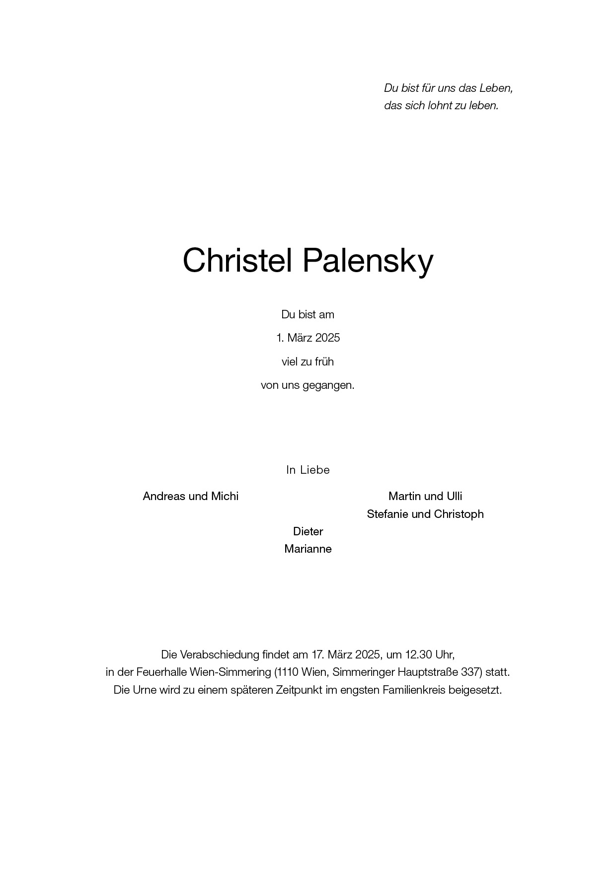 Zum Schutz von Angehörigen gegen unpassende Kommentare. Wir sind eine seriöse Trauerplattform und bitten daher um Verständnis.