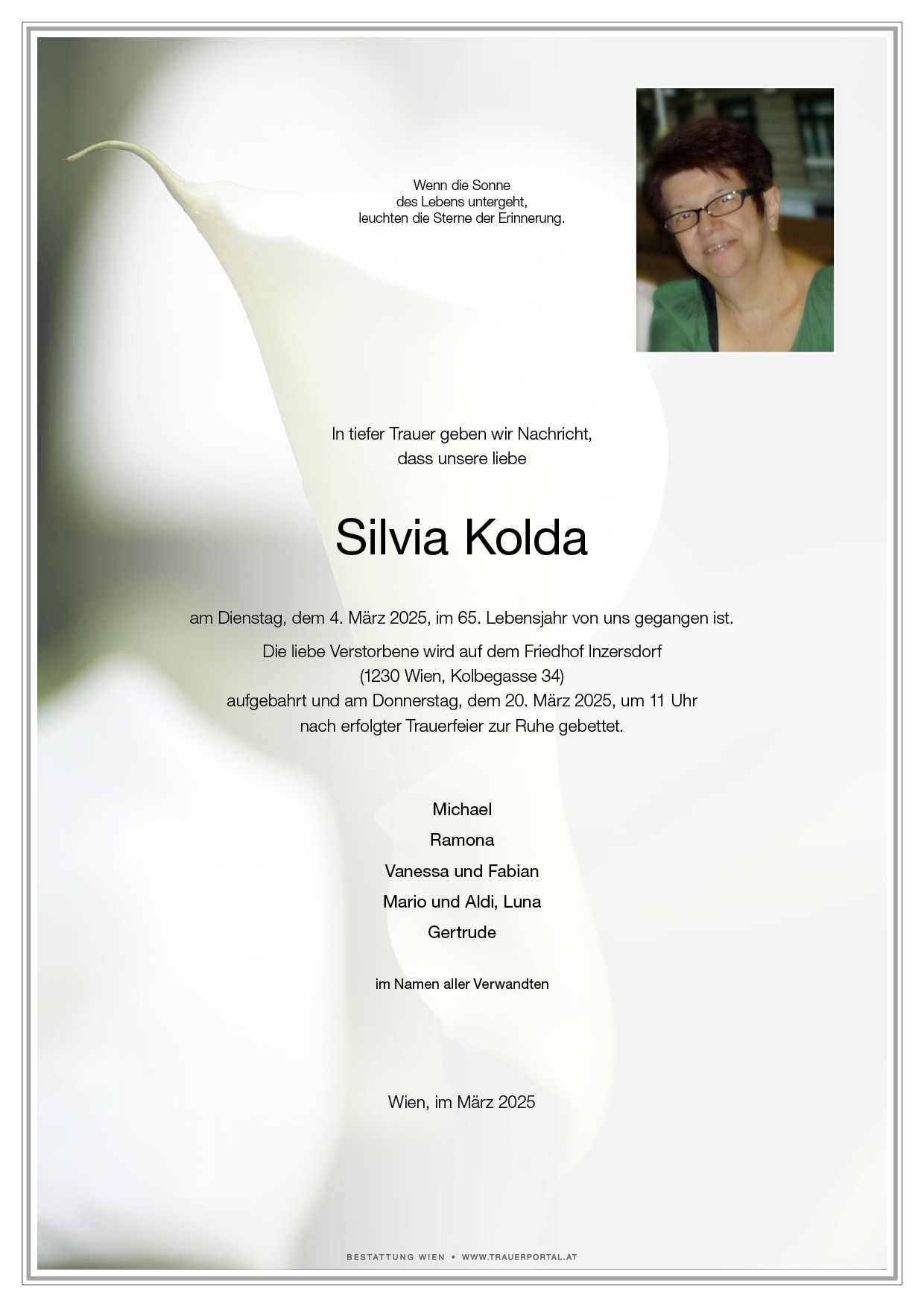Bestattung wurde durchgeführt von: Bestattung Wien Bestattung Wien GmbH Simmeringer Hauptstraße 339 1110 - Wien (Simmering) Tel.: 01 501950 zum Bestatter