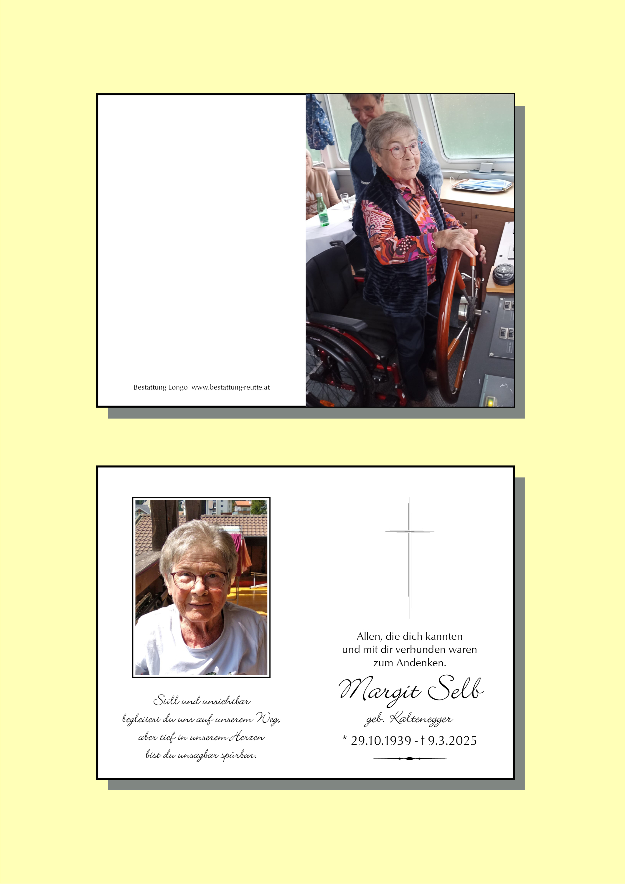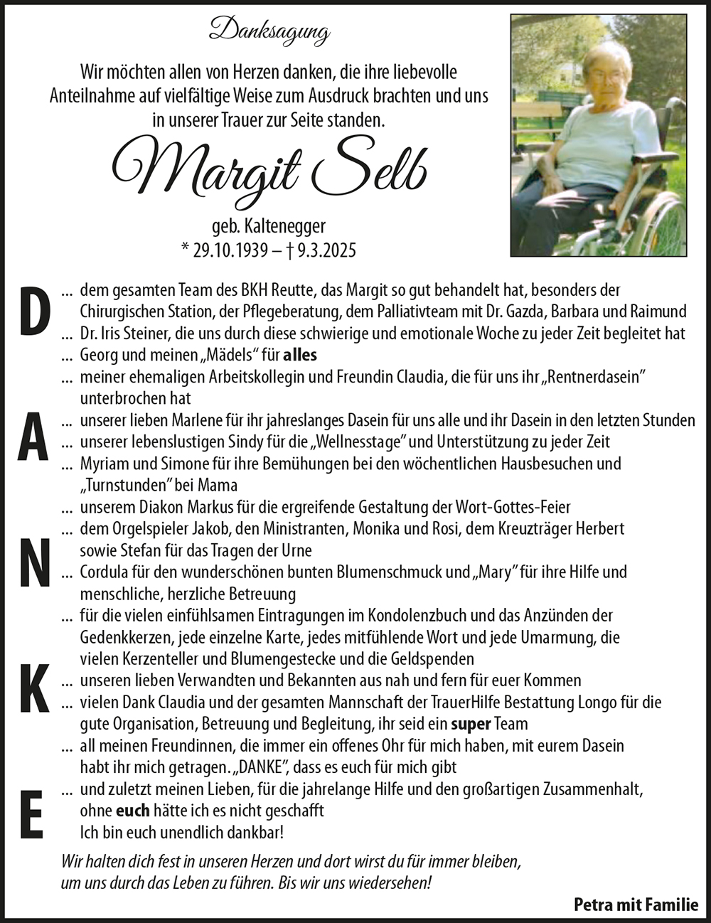 Aufrichtiges Beileid der gesamten Trauerfamilie! Frau Margit Selb war eine sehr lb.Krankenhaus- Bekannte vor vielen Jahren von meiner schon lange verstorbenen Schwiegermutter. Als Sie nicht mehr in der Lage war der Frau Selb zu schreiben habe ich das übernommen. In lieben Gedenken, Gabi Lettenbichler Angerberg im Tiroler Unterland