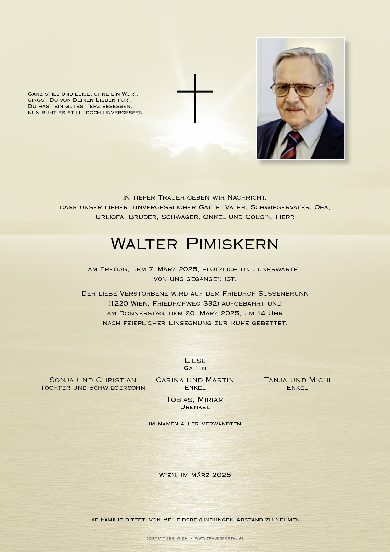 Bestattung wurde durchgeführt von: Bestattung Wien Bestattung Wien GmbH Simmeringer Hauptstraße 339 1110 - Wien (Simmering) Tel.: 01 501950 zum Bestatter
