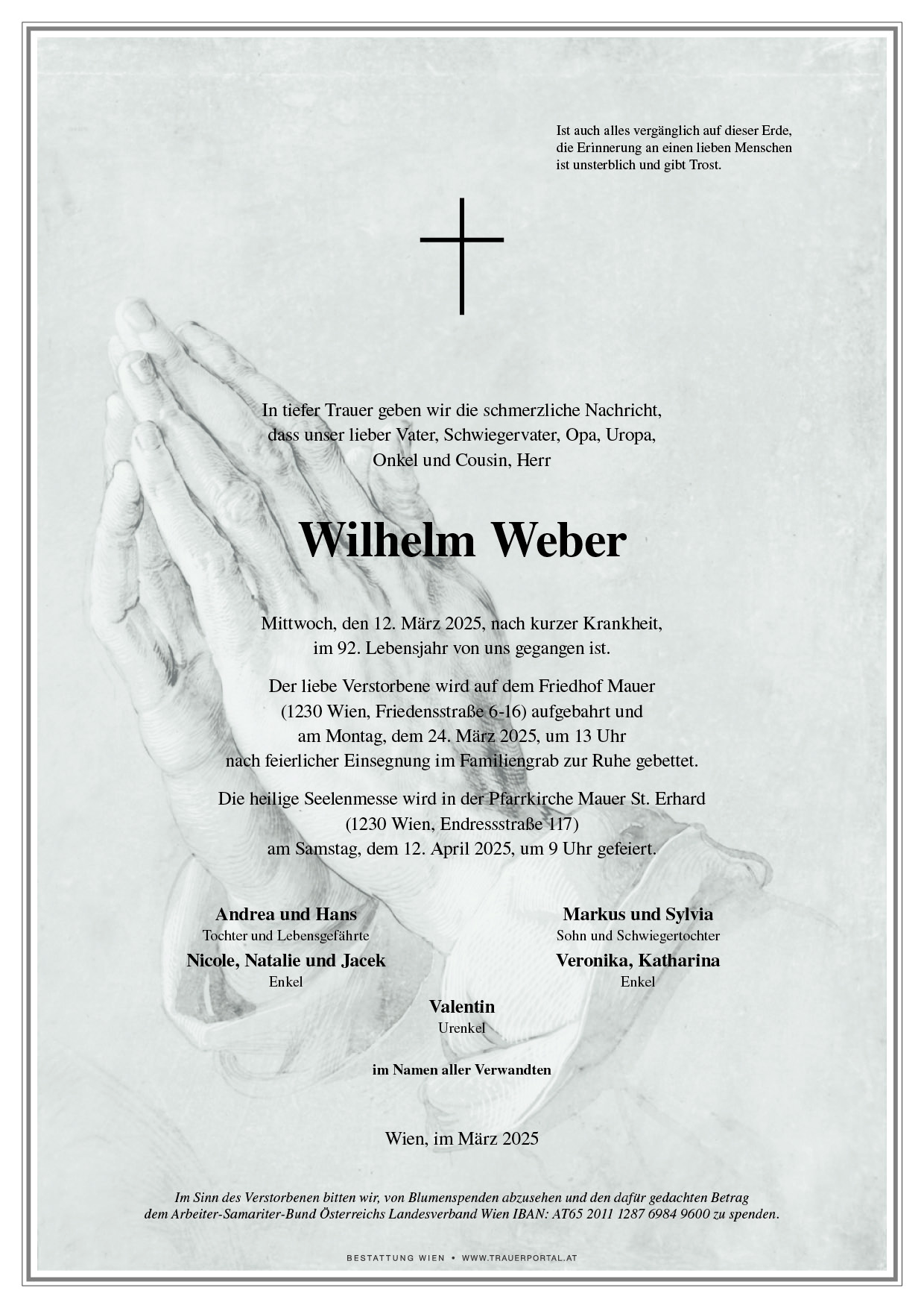 Bestattung wurde durchgeführt von: Bestattung Wien Bestattung Wien GmbH Simmeringer Hauptstraße 339 1110 - Wien (Simmering) Tel.: 01 501950 zum Bestatter
