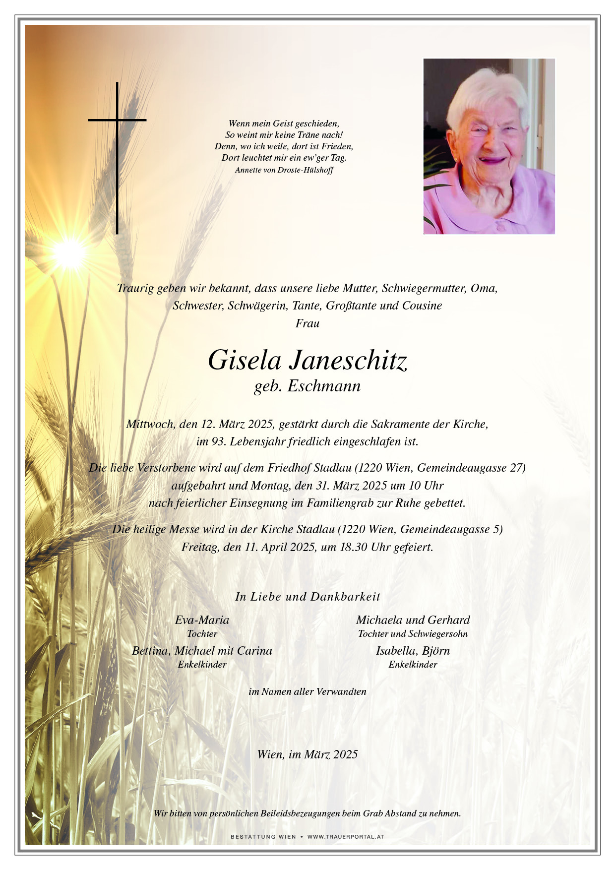 Bestattung wurde durchgeführt von: Bestattung Wien Bestattung Wien GmbH Simmeringer Hauptstraße 339 1110 - Wien (Simmering) Tel.: 01 501950 zum Bestatter