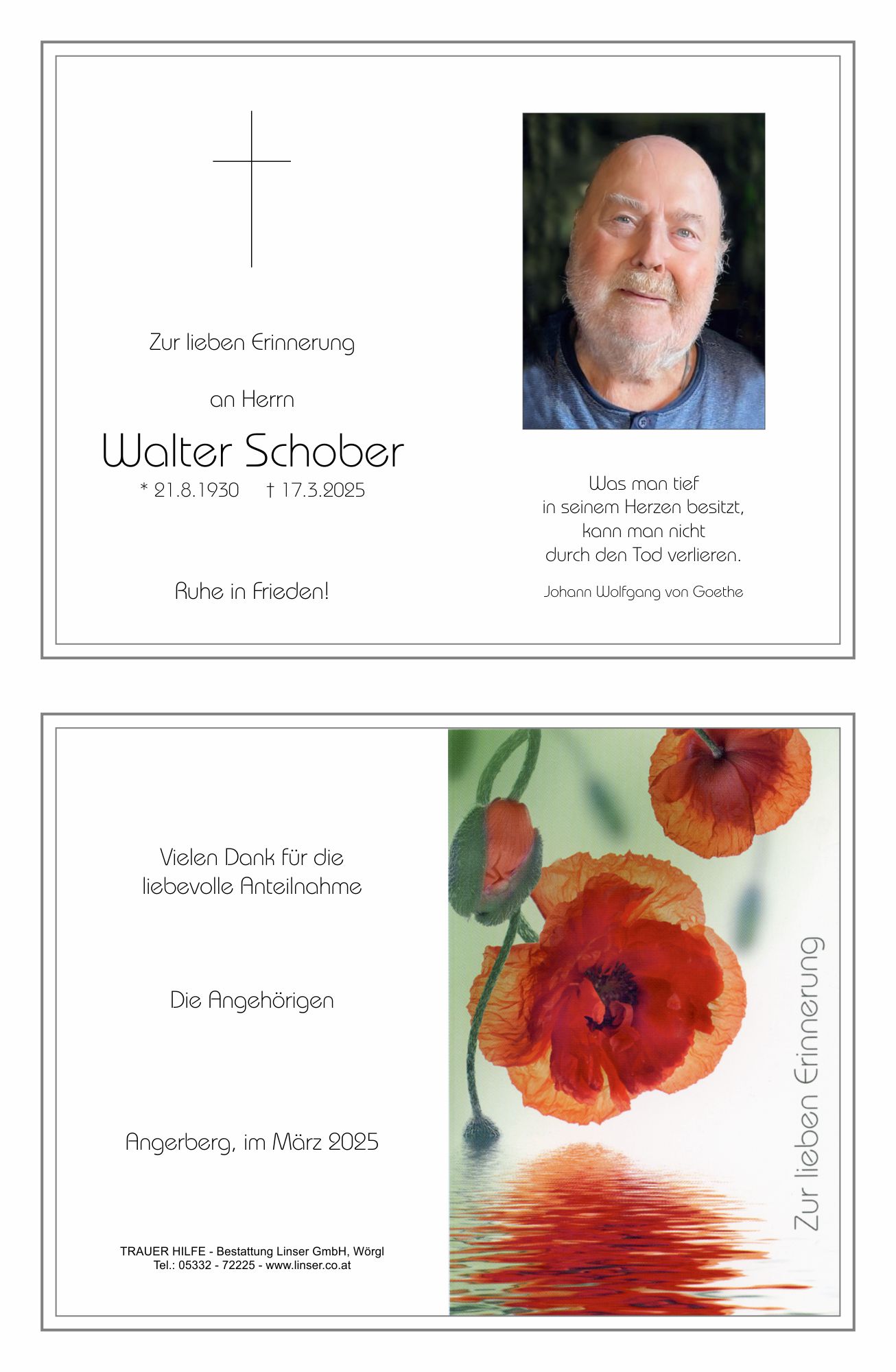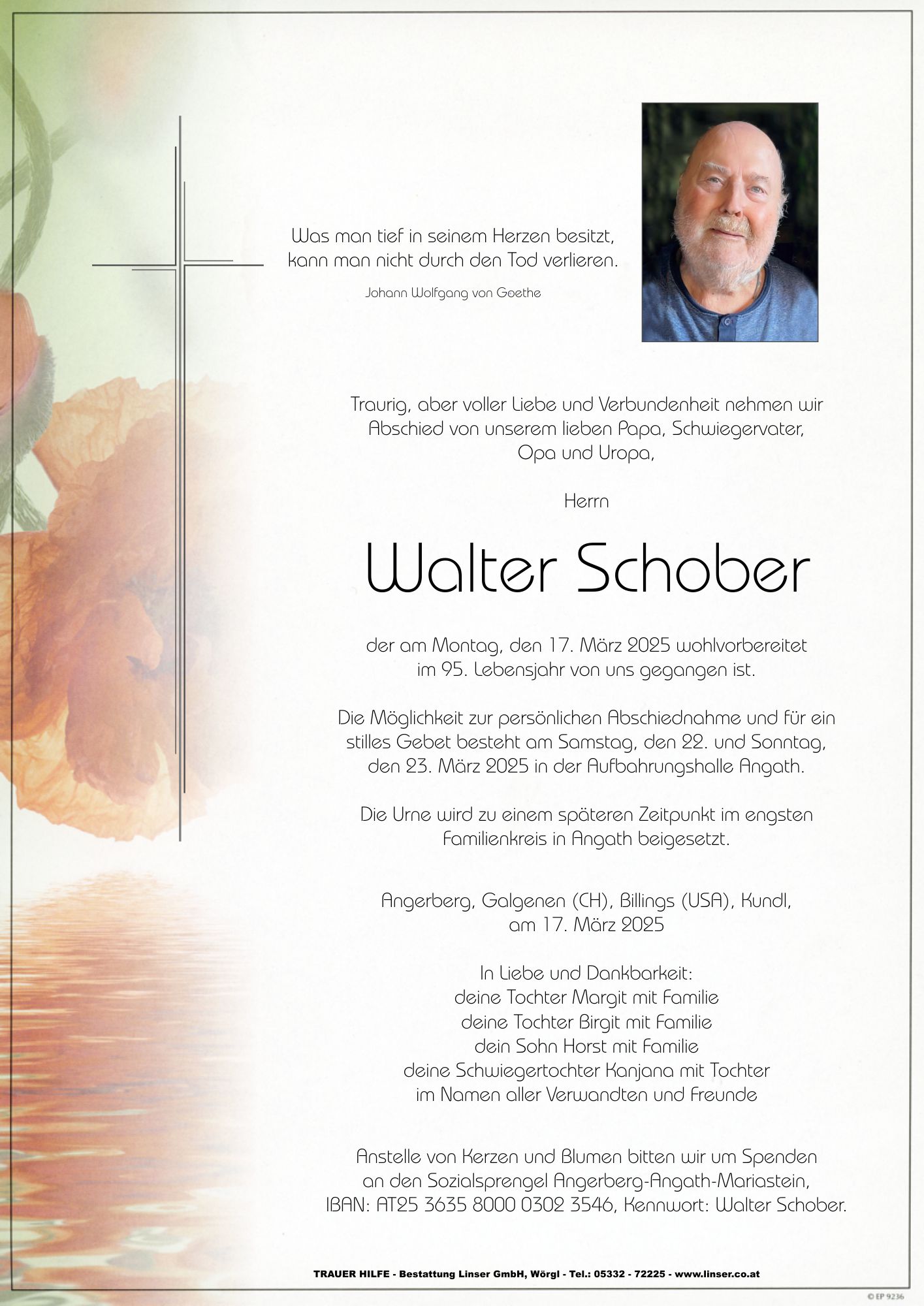 Bestattung wurde durchgeführt von: Walter Linser TrauerHilfe Bestattung Linser GmbH Wildschönauerstraße 41 6300 - Wörgl Tel.: 05332 72225 zum Bestatter