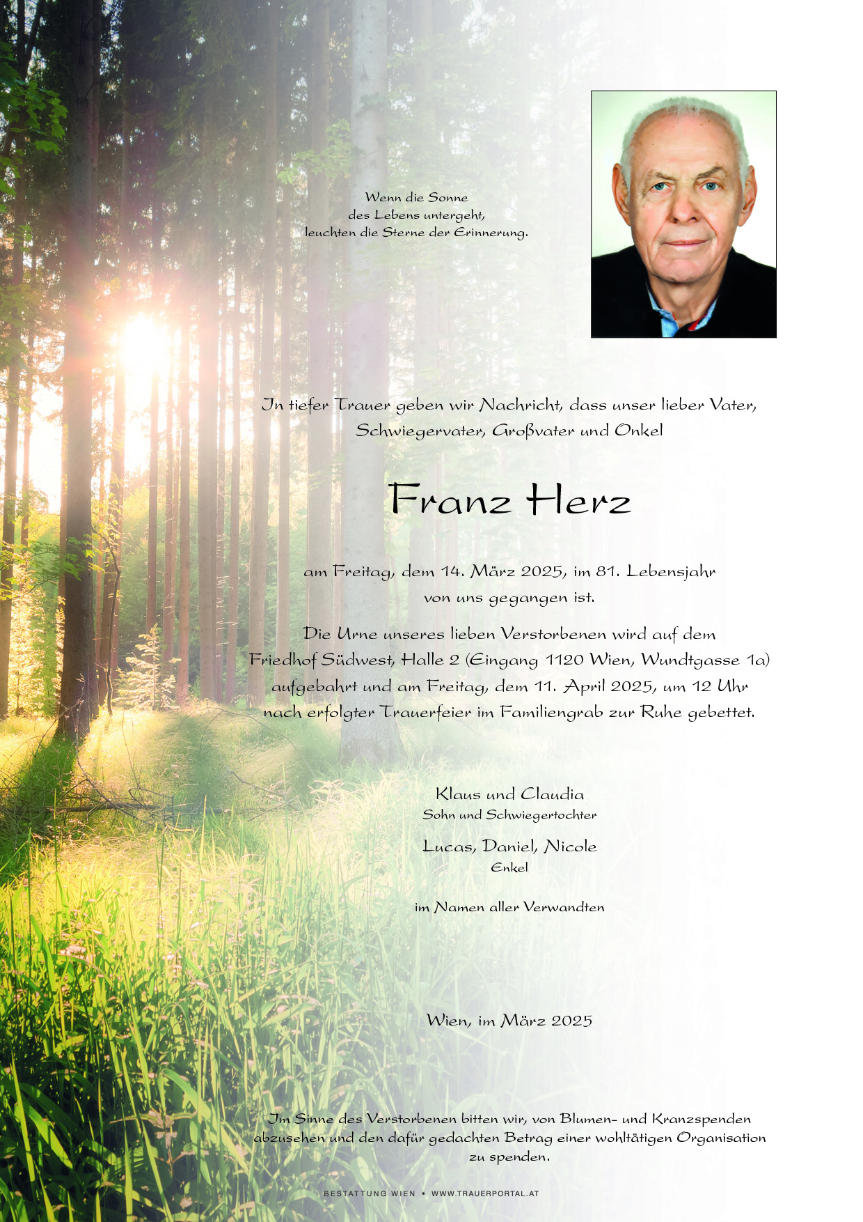 Bestattung wurde durchgeführt von: Bestattung Wien Bestattung Wien GmbH Simmeringer Hauptstraße 339 1110 - Wien (Simmering) Tel.: 01 501950 zum Bestatter