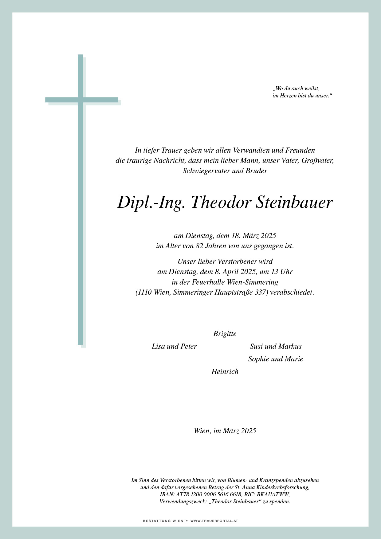 Bestattung wurde durchgeführt von: Bestattung Wien Bestattung Wien GmbH Simmeringer Hauptstraße 339 1110 - Wien (Simmering) Tel.: 01 501950 zum Bestatter