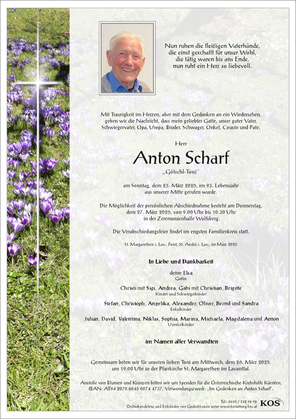 Bestattung wurde durchgeführt von: Familienbetrieb Bestattung Kos Bestattung A. & J. Kos GmbH Krankenhausstraße 2A 9400 - Wolfsberg Tel.: 0650 242 98 98 zum Bestatter