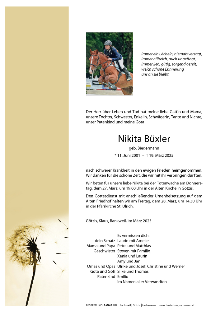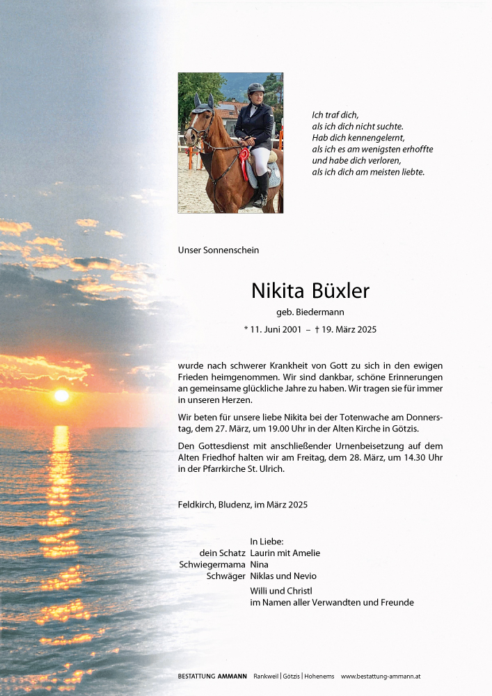 Bestattung wurde durchgeführt von: Bestattung Ammann Rankweil Ammann Bestattung GmbH Rankweil Splügenweg 1 6830 - Rankweil Tel.: 05522 42104 zum Bestatter
