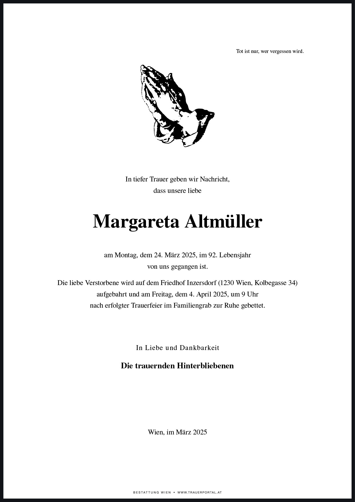 Bestattung wurde durchgeführt von: Bestattung Wien Bestattung Wien GmbH Simmeringer Hauptstraße 339 1110 - Wien (Simmering) Tel.: 01 501950 zum Bestatter