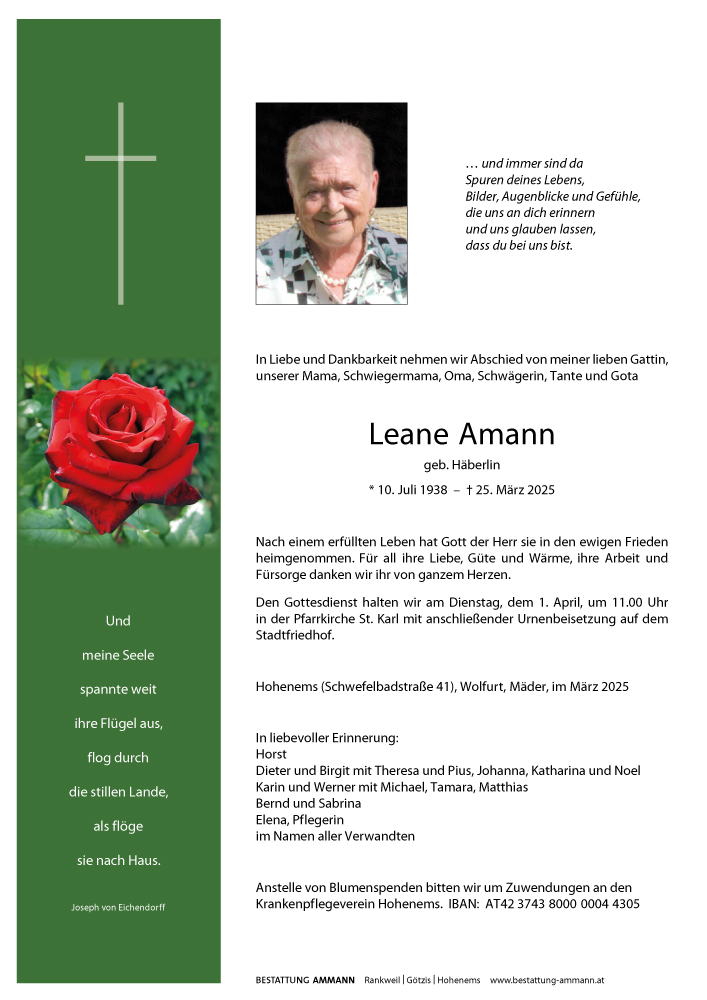 Bestattung wurde durchgeführt von: Bestattung Ammann Rankweil Ammann Bestattung GmbH Rankweil Splügenweg 1 6830 - Rankweil Tel.: 05522 42104 zum Bestatter