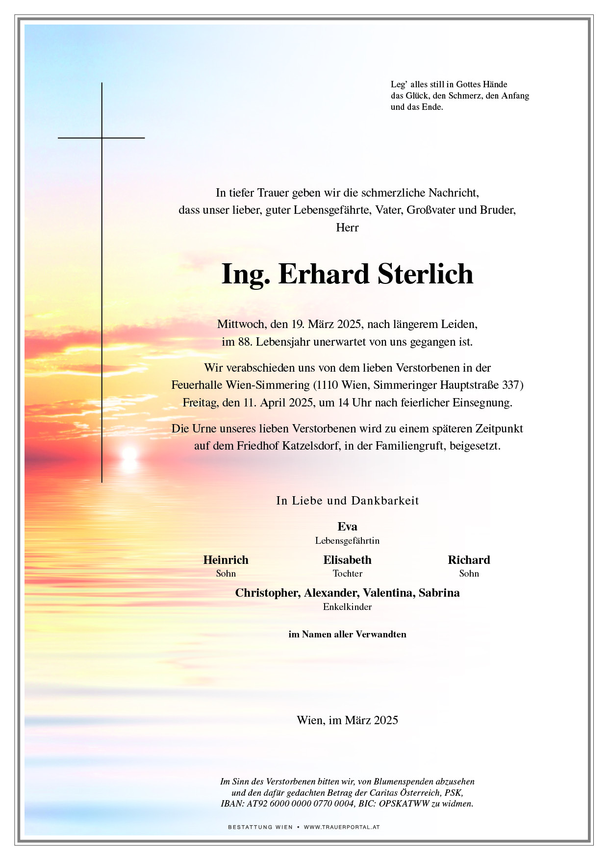Bestattung wurde durchgeführt von: Bestattung Wien Bestattung Wien GmbH Simmeringer Hauptstraße 339 1110 - Wien (Simmering) Tel.: 01 501950 zum Bestatter