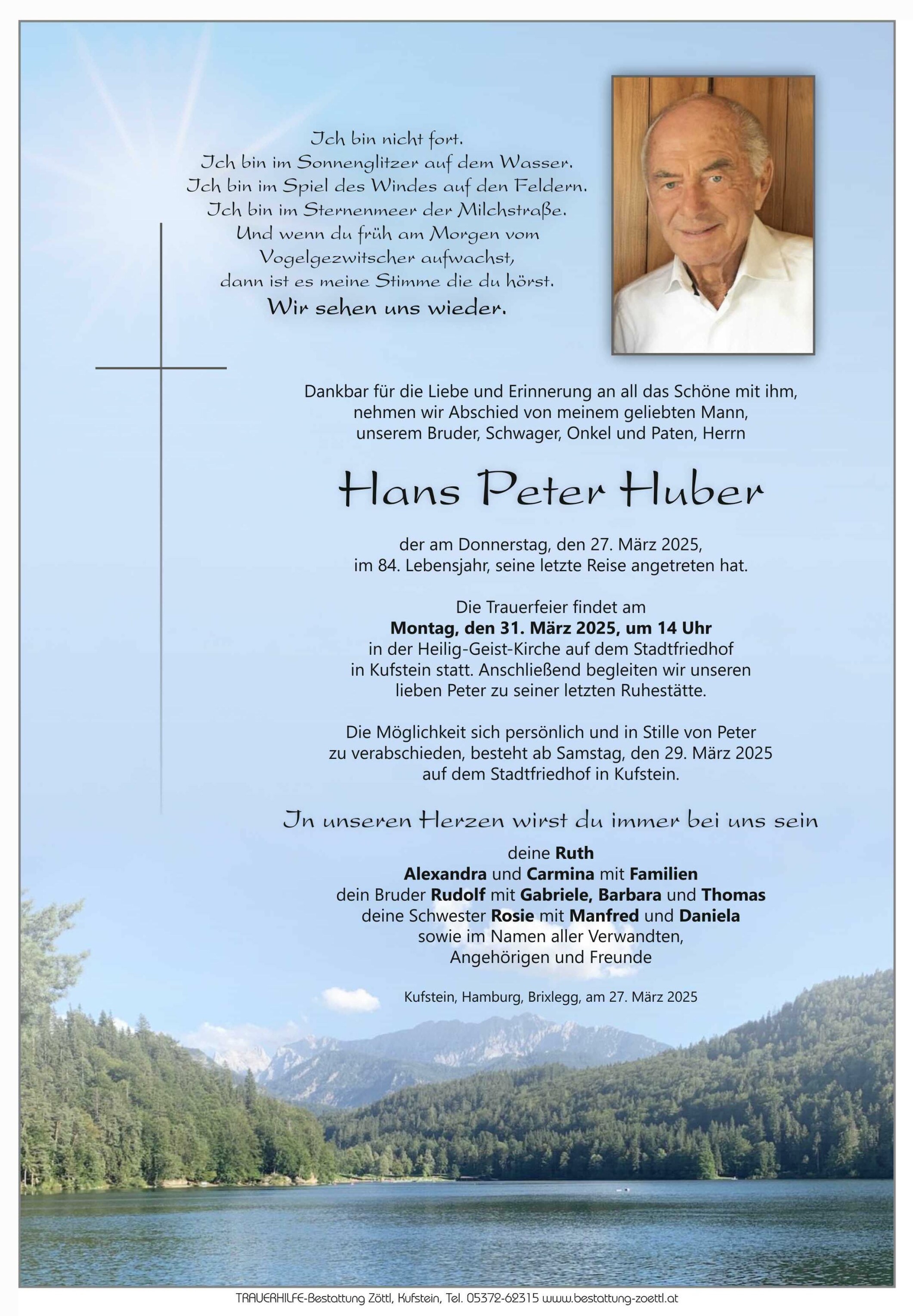 Bestattung wurde durchgeführt von: Florian Zöttl TrauerHilfe Bestattung Zöttl Andreas Hofer Str. 2 6330 - Kufstein Tel.: 05372 6 23 15 zum Bestatter