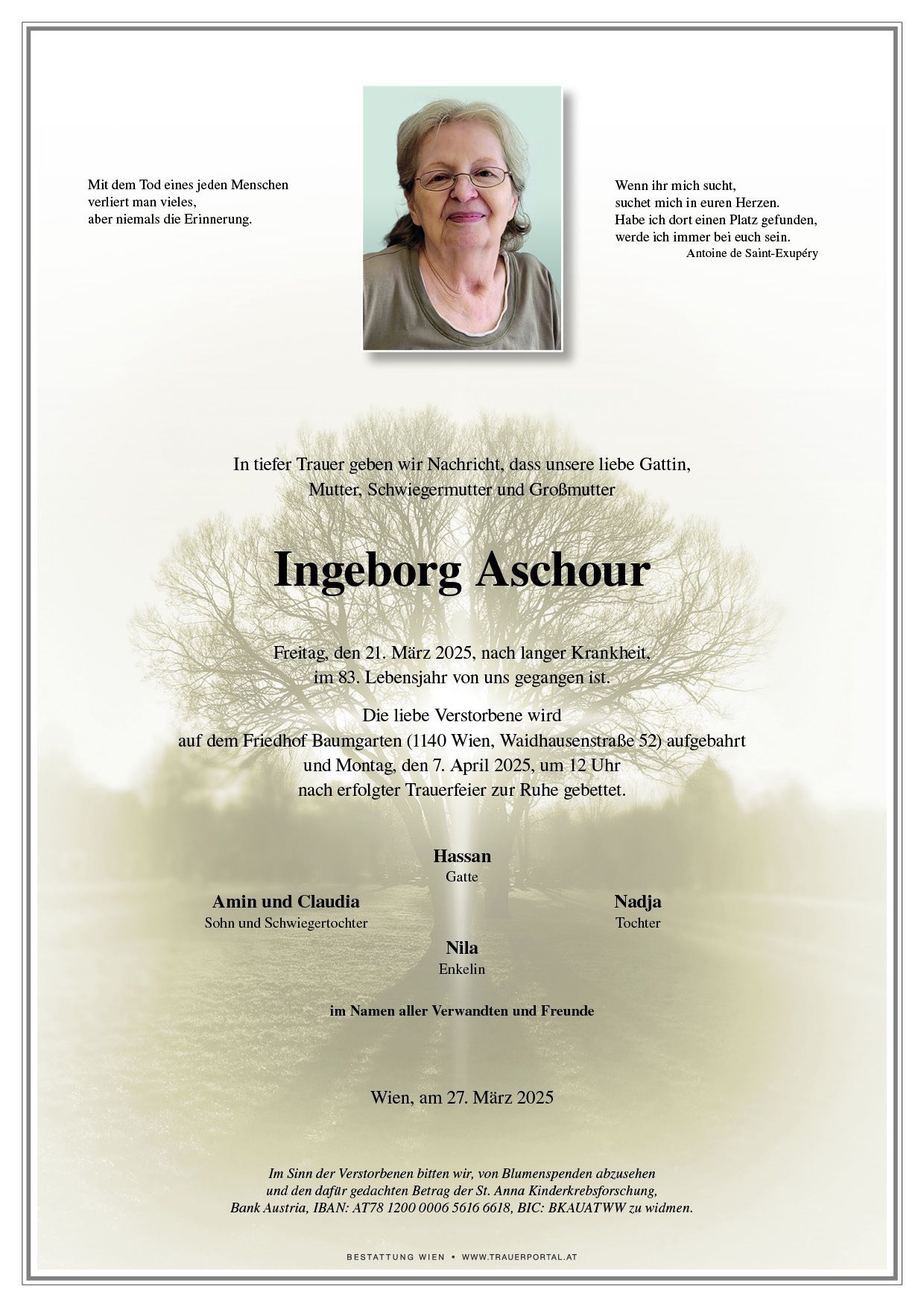 Bestattung wurde durchgeführt von: Bestattung Wien Bestattung Wien GmbH Simmeringer Hauptstraße 339 1110 - Wien (Simmering) Tel.: 01 501950 zum Bestatter