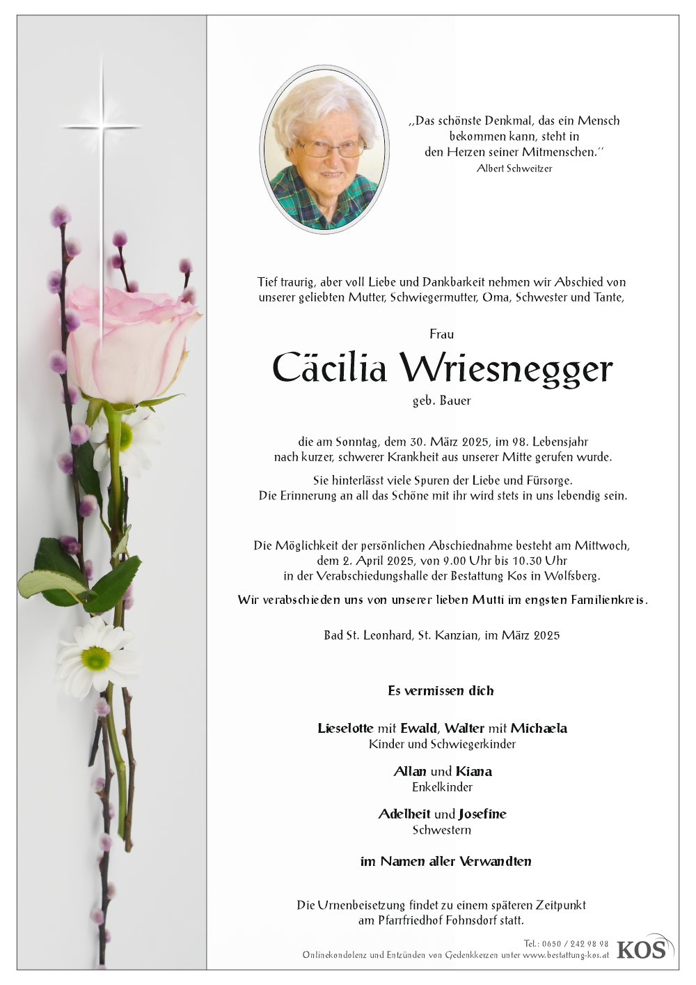 Bestattung wurde durchgeführt von: Familienbetrieb Bestattung Kos Bestattung A. & J. Kos GmbH Krankenhausstraße 2A 9400 - Wolfsberg Tel.: 0650 242 98 98 zum Bestatter