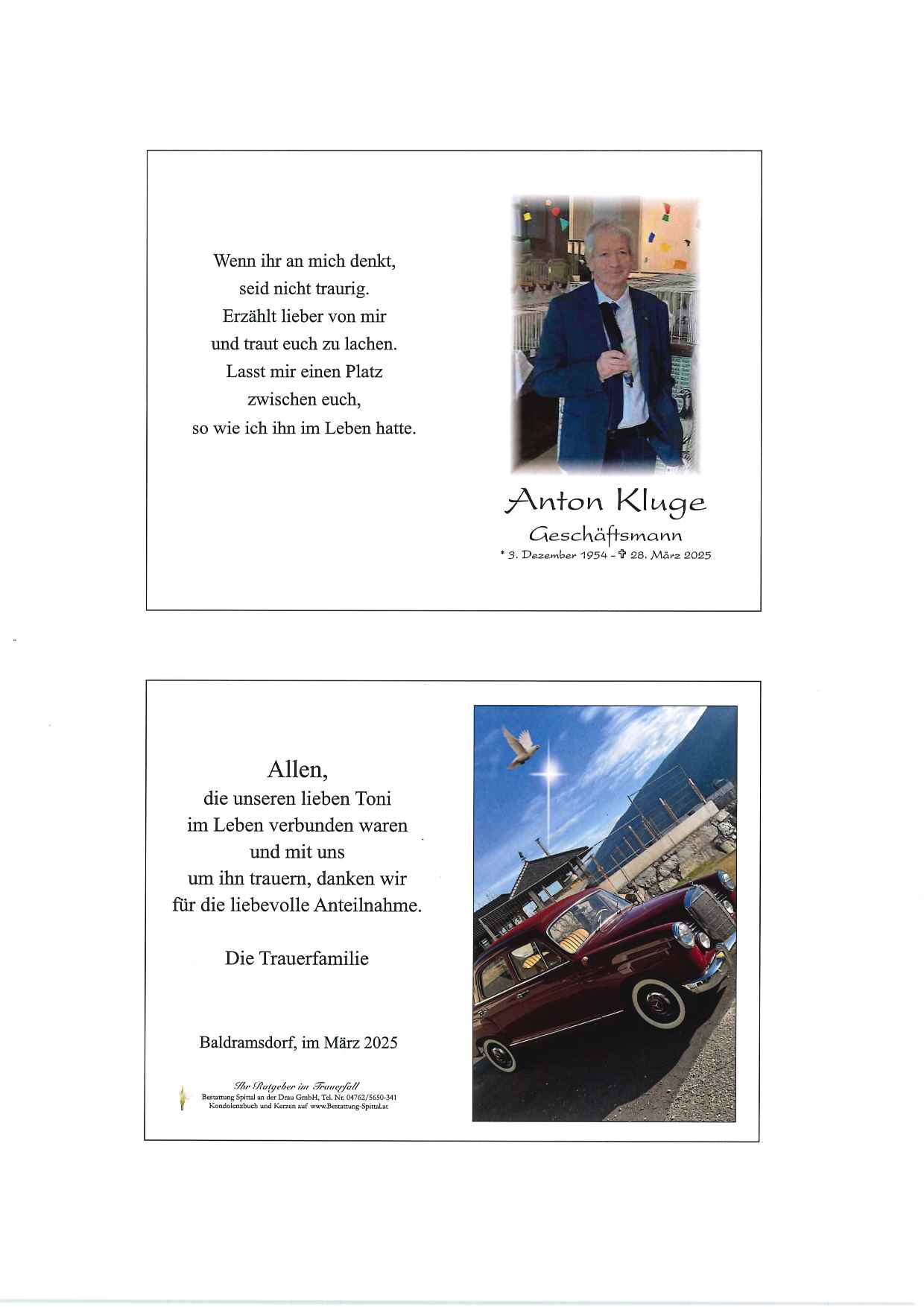 Mit tiefem Mitgefühl möchte ich mein herzliches Beileid zum Verlust von unserem Toni ausdrücken. Möge der Glaube an die Auferstehung und das ewige Leben euch in dieser schweren Zeit Trost und Hoffnung spenden.