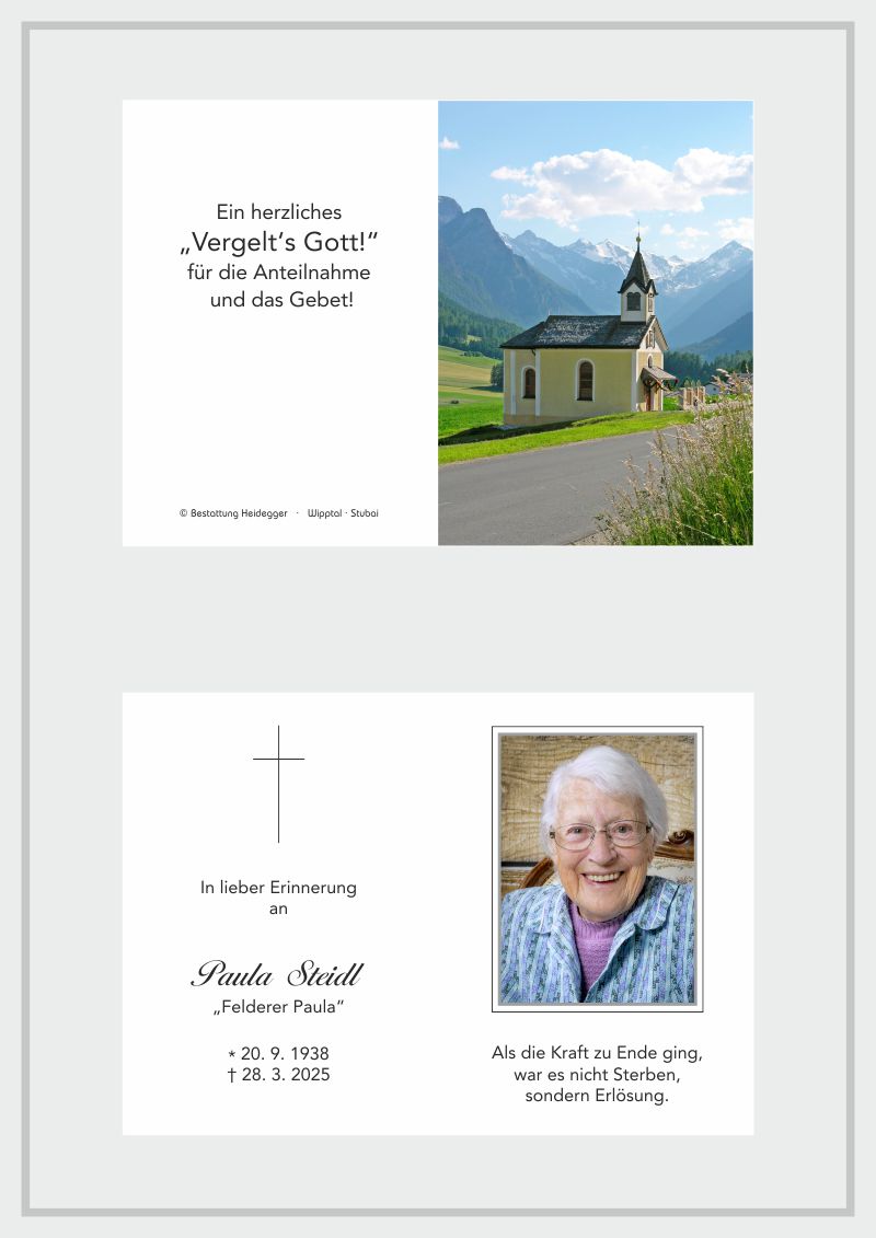 Bestattung wurde durchgeführt von: Karl Neurauter Karl Neurauter Bestattung Heidegger Brennerstraße 69 6150 - Steinach am Brenner Tel.: 05275 5211 zum Bestatter