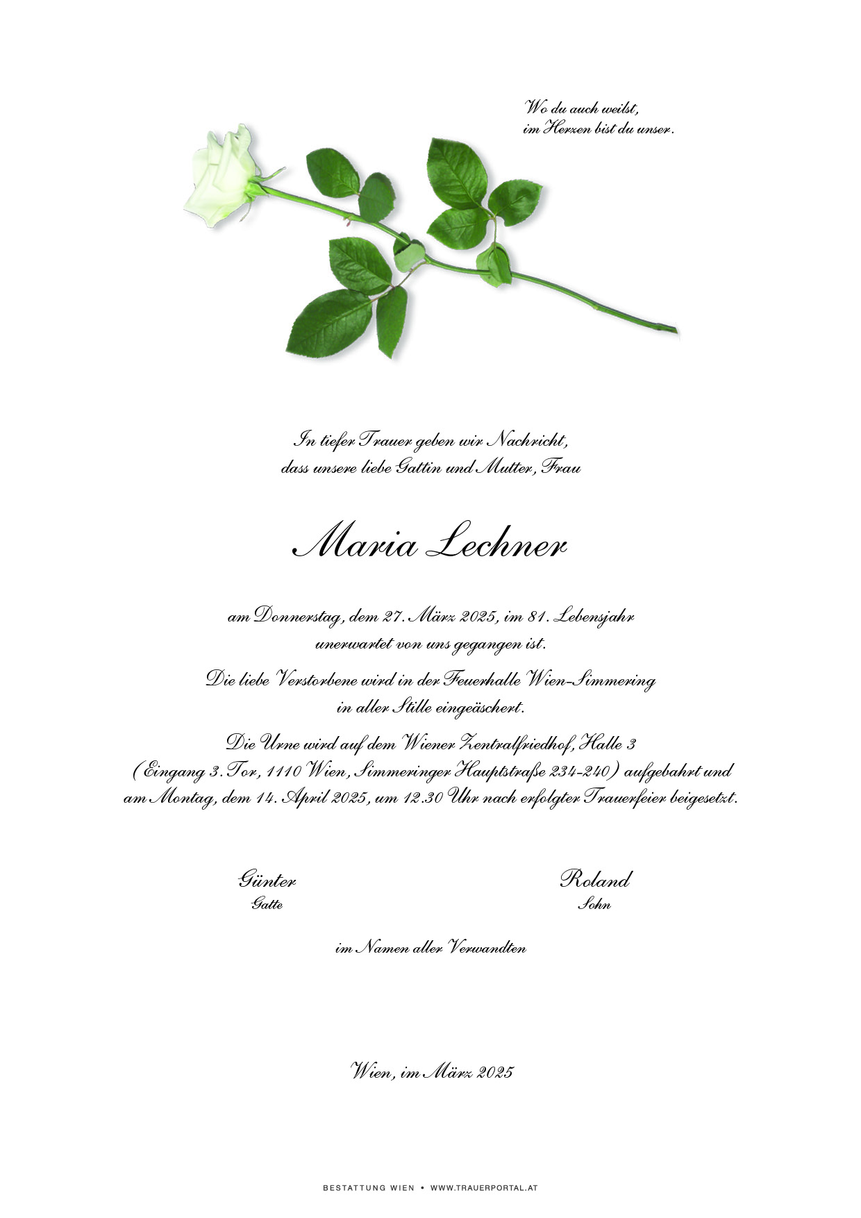 Bestattung wurde durchgeführt von: Bestattung Wien Bestattung Wien GmbH Simmeringer Hauptstraße 339 1110 - Wien (Simmering) Tel.: 01 501950 zum Bestatter