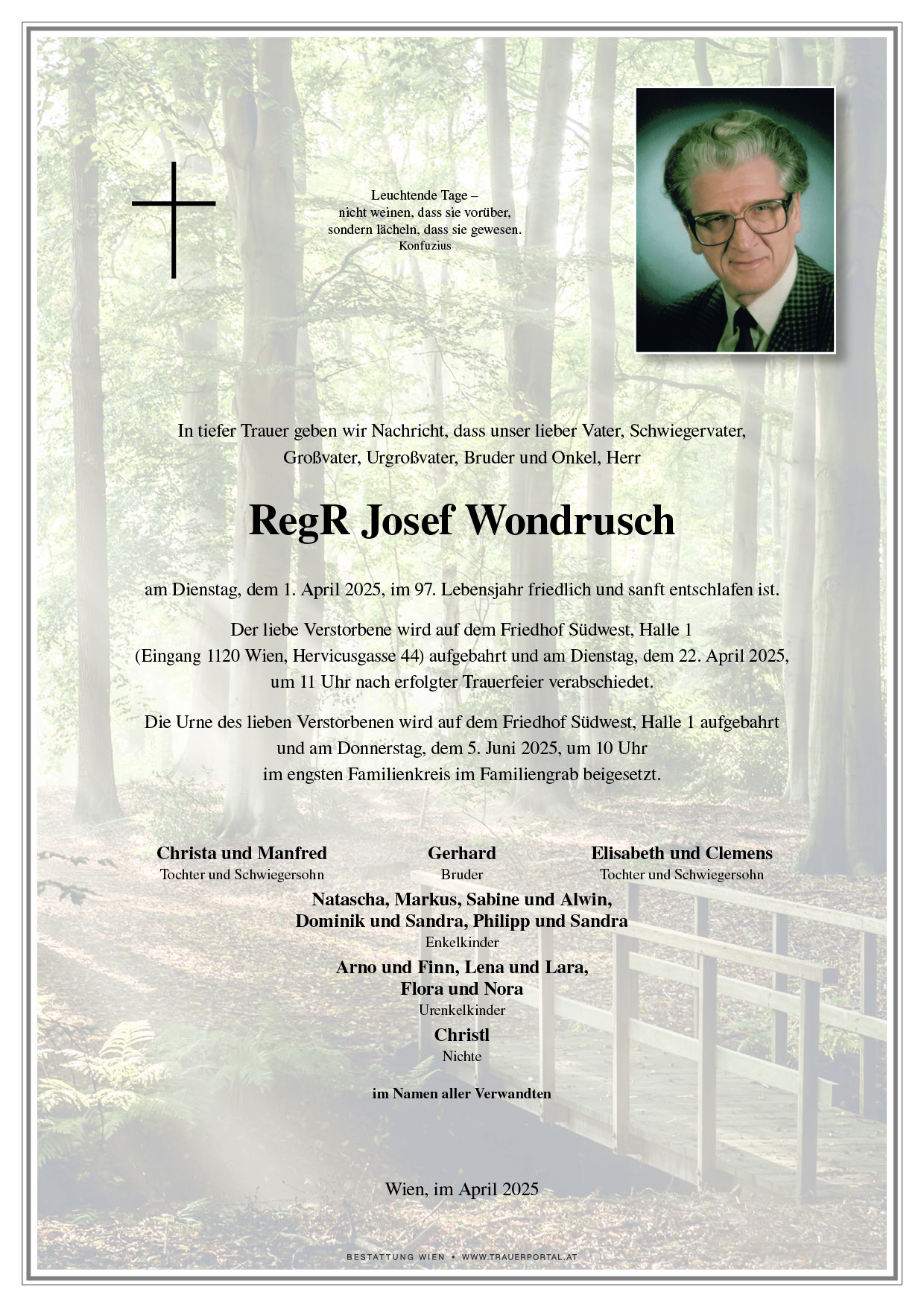 Bestattung wurde durchgeführt von: Bestattung Wien Bestattung Wien GmbH Simmeringer Hauptstraße 339 1110 - Wien (Simmering) Tel.: 01 501950 zum Bestatter