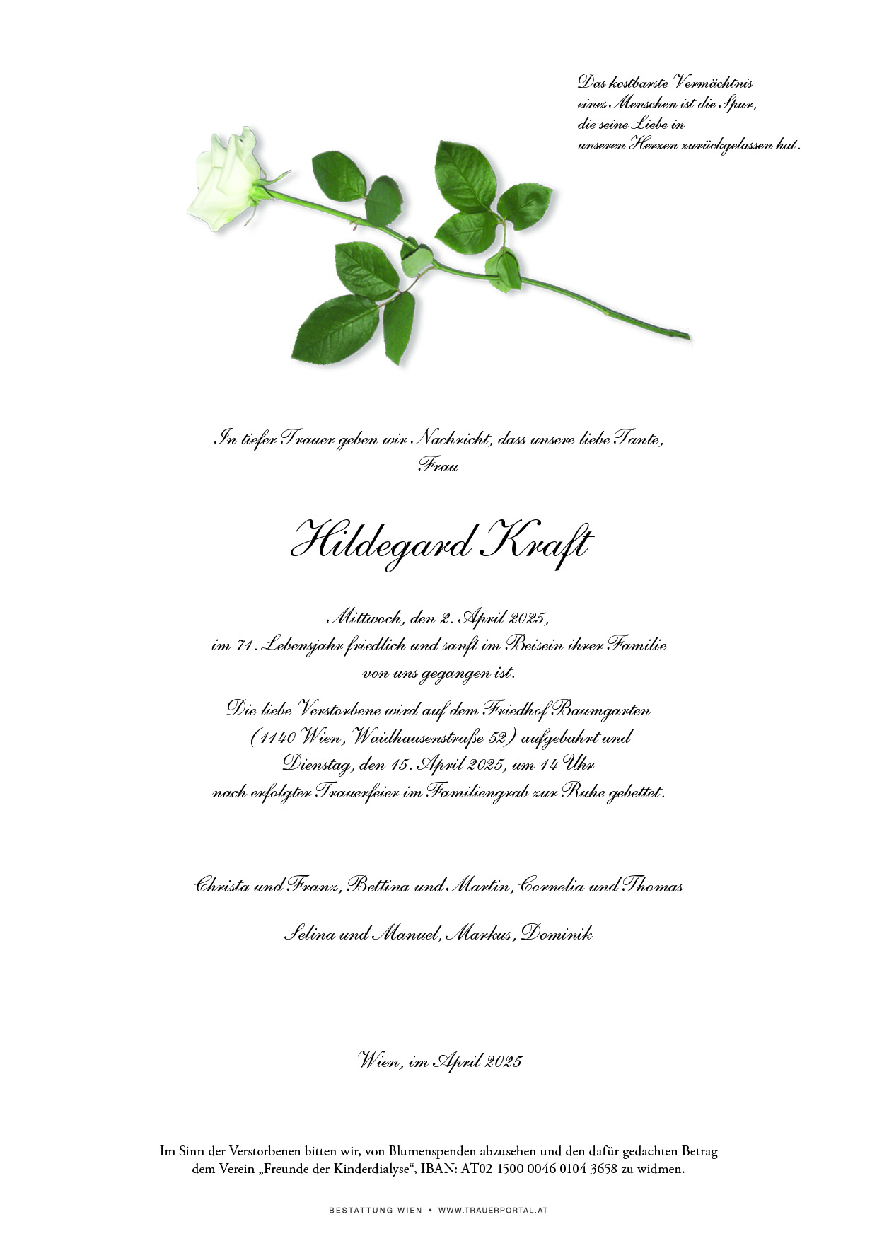 Bestattung wurde durchgeführt von: Bestattung Wien Bestattung Wien GmbH Simmeringer Hauptstraße 339 1110 - Wien (Simmering) Tel.: 01 501950 zum Bestatter
