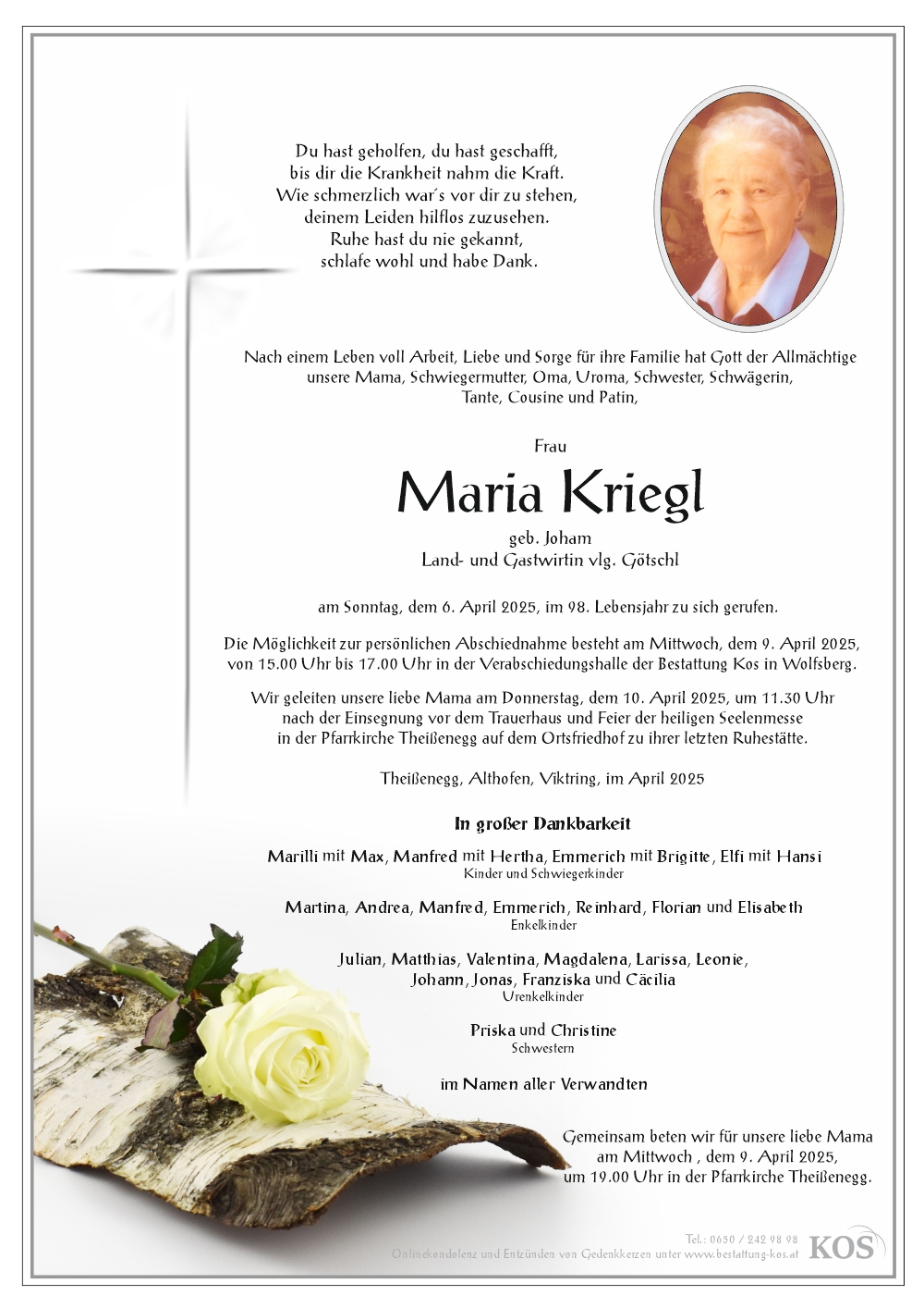 • Liebe Götschl Familie. Wir möchten euch zum Ableben eurer lieben Omi unser herzliches Beileid aussprechen. Wir werden sie als liebe Freundin in Erinnerung behalten. Familie Freigassner