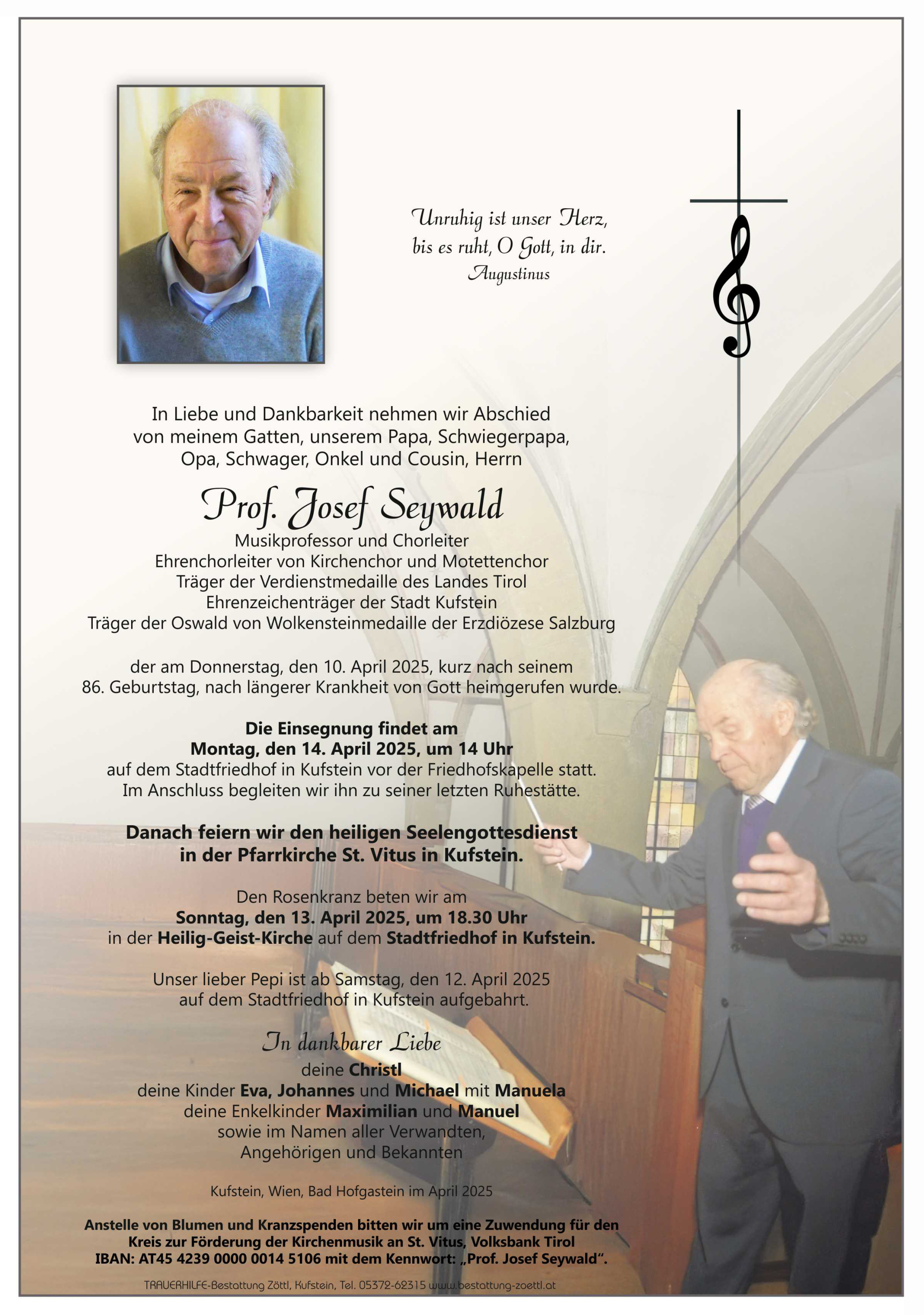 wir Sänger:innen des Tiroler Motettenchores Stadt Wörgl behalten Pepi stets ein ehrendes Andenken, und immer wieder werden wir uns an ihn erinnern, wenn wir Werke zur Aufführung bringen, die wir mit unserem geschätzten Pepi erarbeitet und gesungen haben.