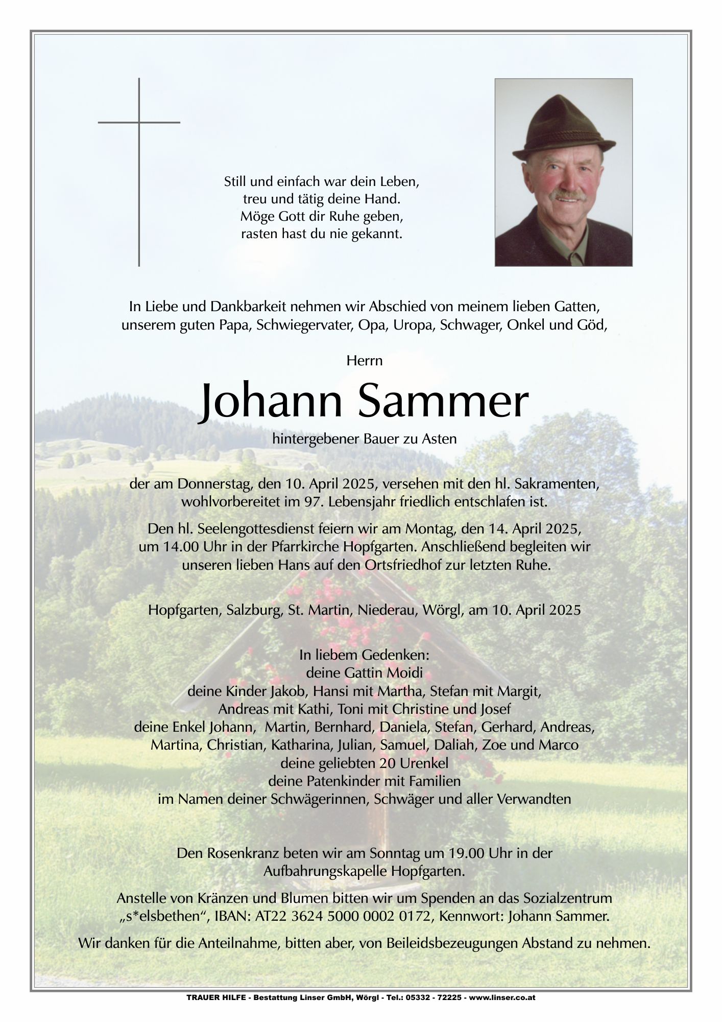Bestattung wurde durchgeführt von: Walter Linser TrauerHilfe Bestattung Linser GmbH Wildschönauerstraße 41 6300 - Wörgl Tel.: 05332 72225 zum Bestatter
