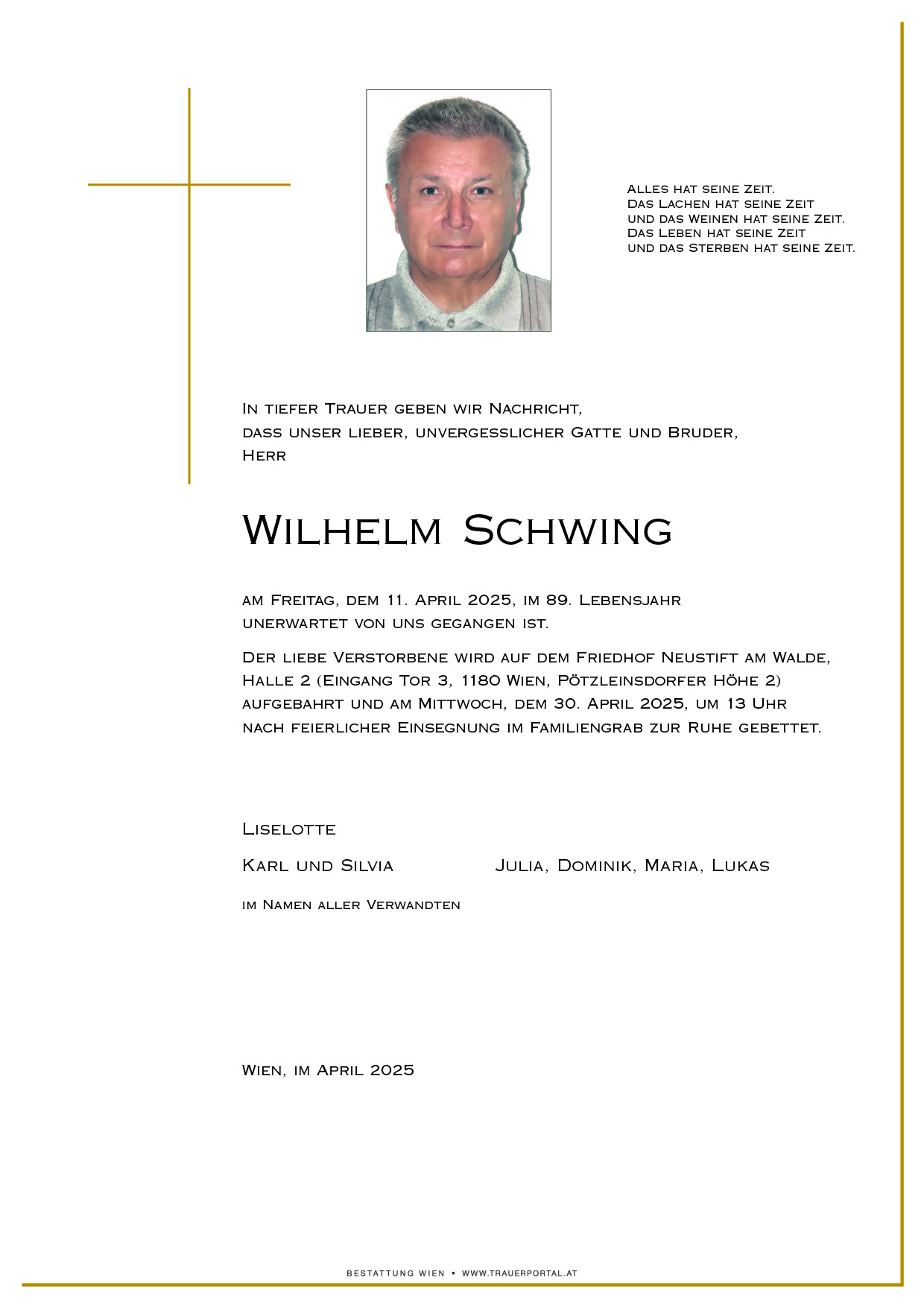 Bestattung wurde durchgeführt von: Bestattung Wien Bestattung Wien GmbH Simmeringer Hauptstraße 339 1110 - Wien (Simmering) Tel.: 01 501950 zum Bestatter