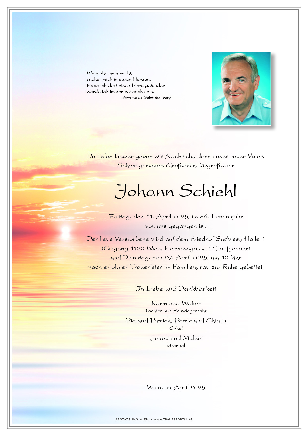 Bestattung wurde durchgeführt von: Bestattung Wien Bestattung Wien GmbH Simmeringer Hauptstraße 339 1110 - Wien (Simmering) Tel.: 01 501950 zum Bestatter